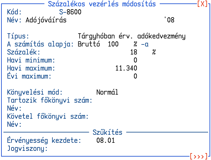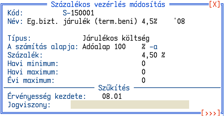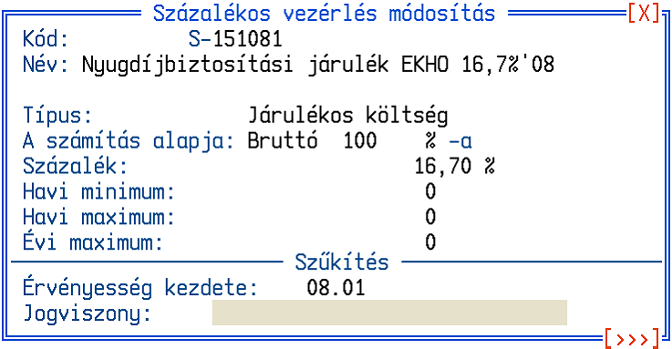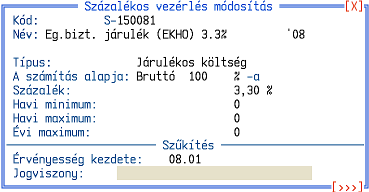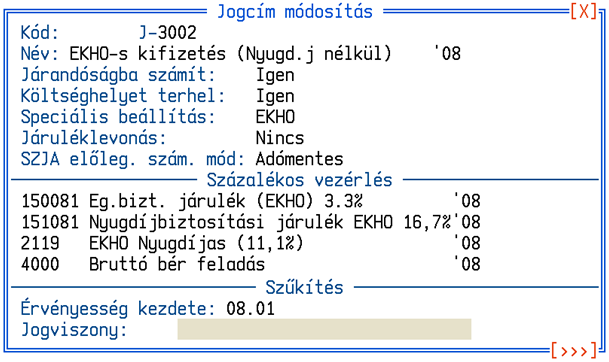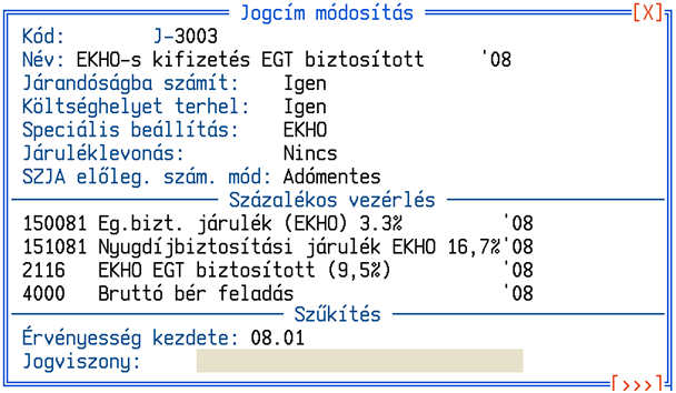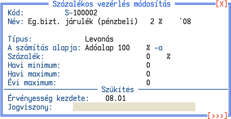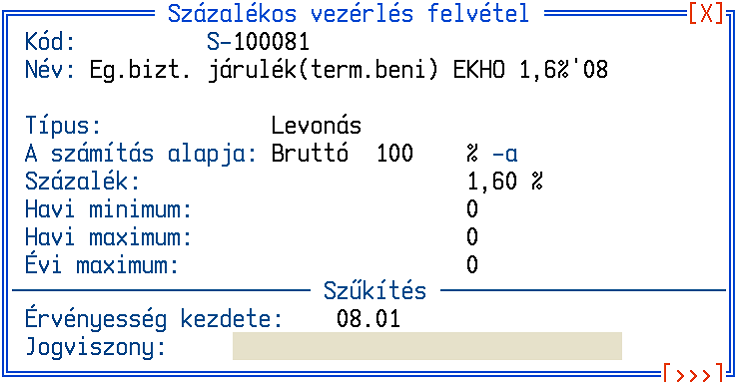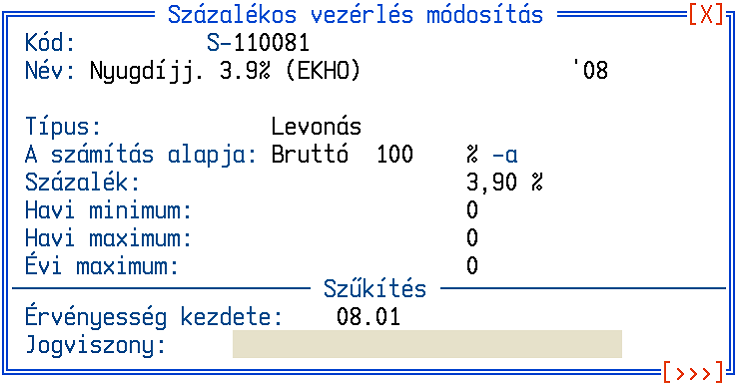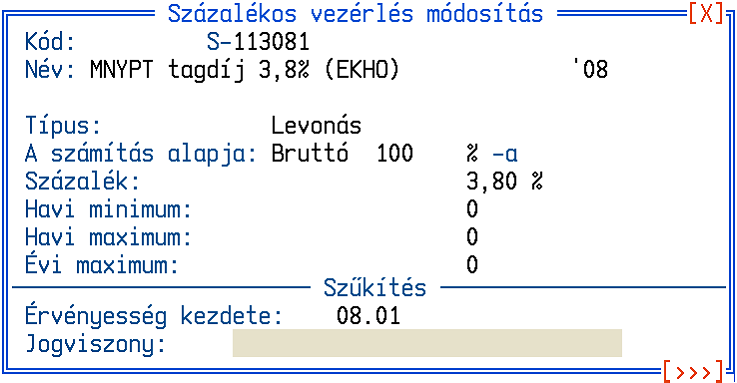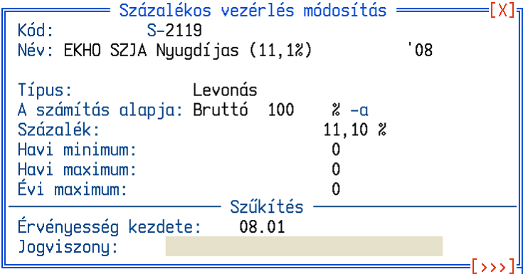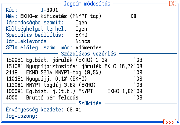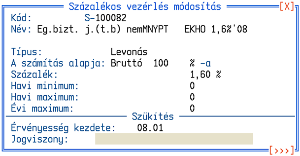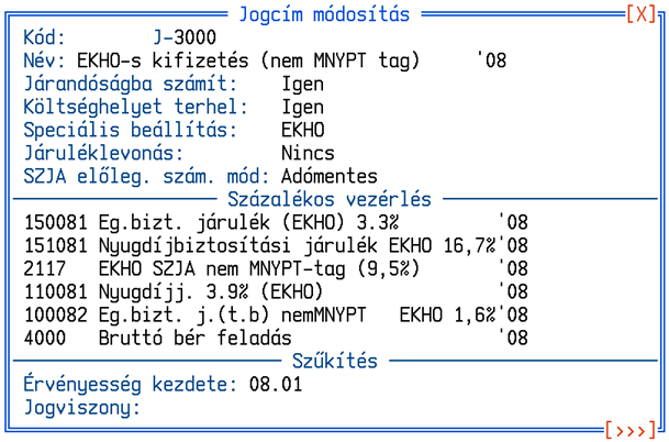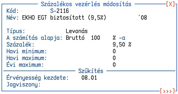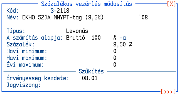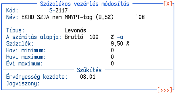 - EKHO SZJA 11%-ról 9,5 százalékra csökkent, ha munkavállaló nem nyugdíjas. A 0808M bevallás egyszerűbb kitöltése miatt az MNYPT-tag és nem tag embernek külön százalékos vezérlést definiáltunk az alábbiak szerint.