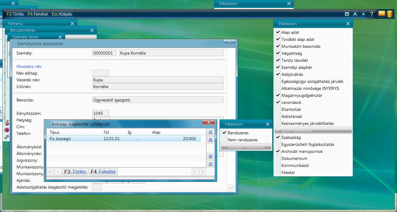 Fix összegű algoritmus lényege, hogy a munkavállaló nyilatkozata alapján kerül számfejtésre az adóalap kiegészítés összege. A Személytörzsben az Adóalap-kiegészítés alapját kell megadni.