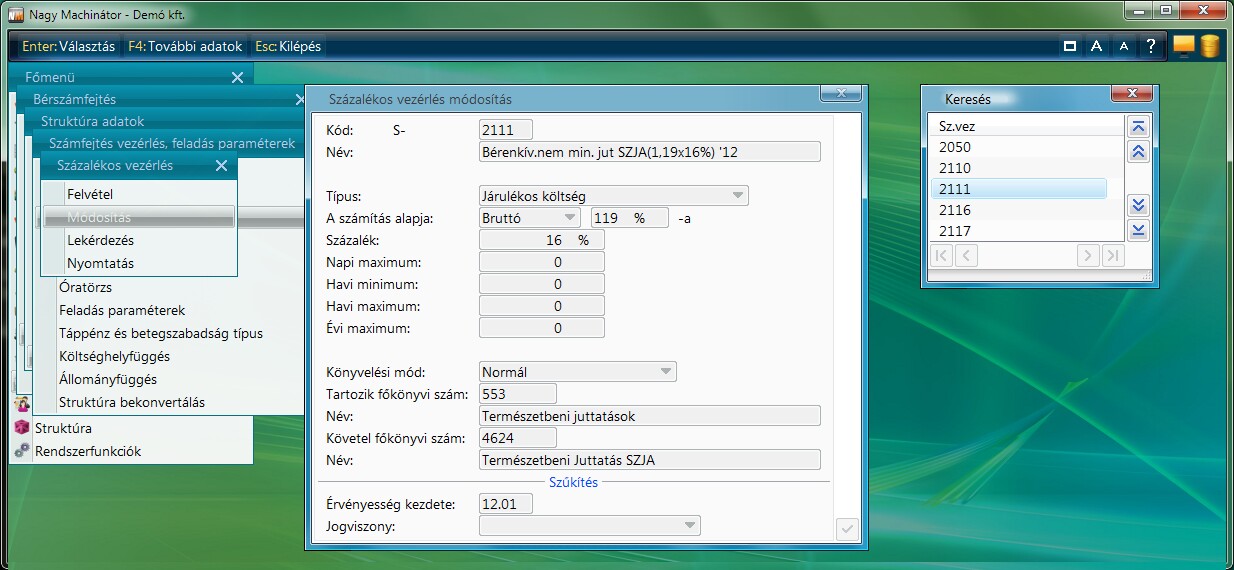 A bérjegyzék nyomtatásához meg kell adni, hogy milyen százalékos vezérlésekre leszámfejtett összegeket kell a bérjegyzék alján részletezni. Pl.: S92*+S8000+S8010+S115* |