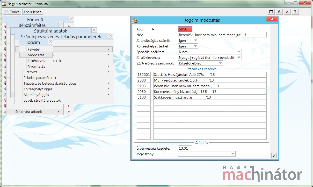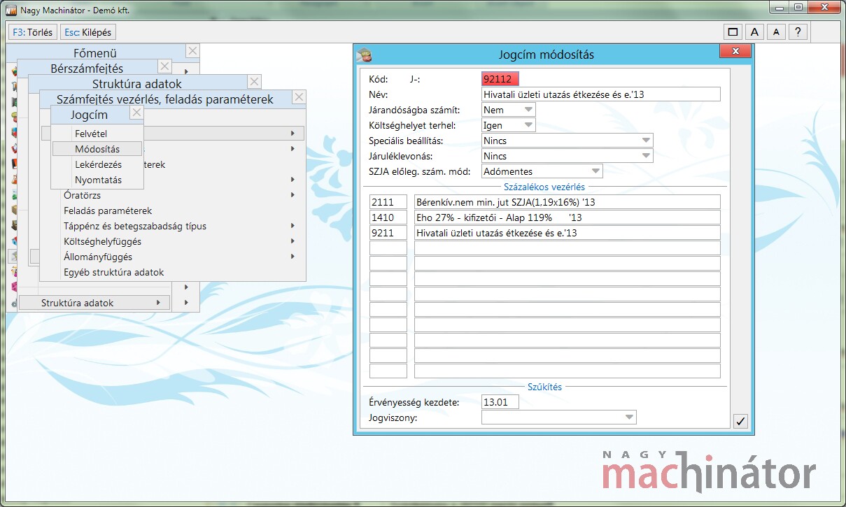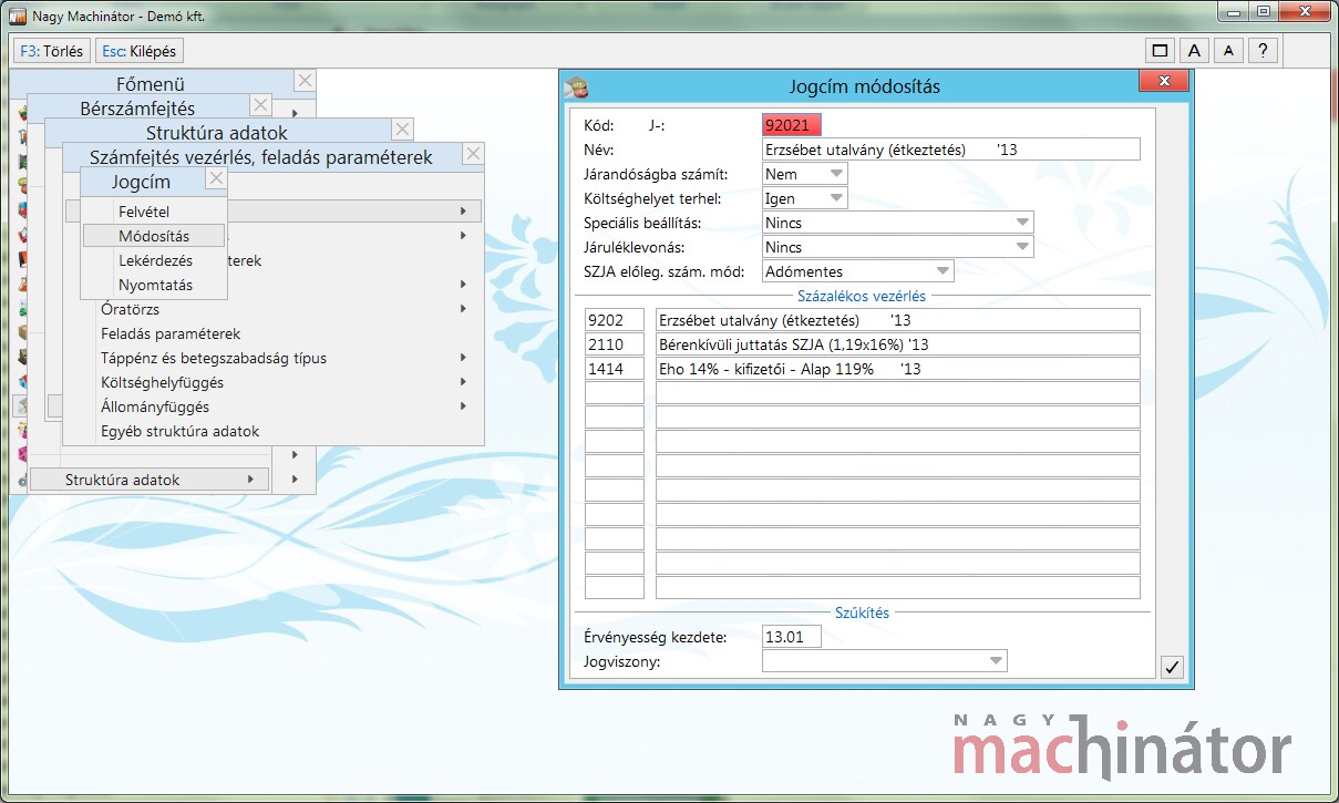 Minden egyes Béren kívüli juttatás jogcímként jelenik meg a programban. A bérelemek felvétele során a megfelelő jogcímet kell kiválasztani.