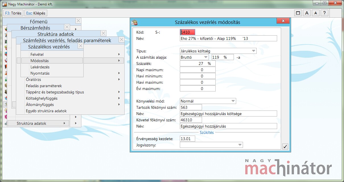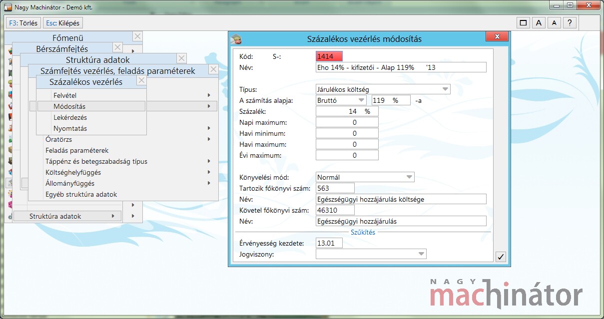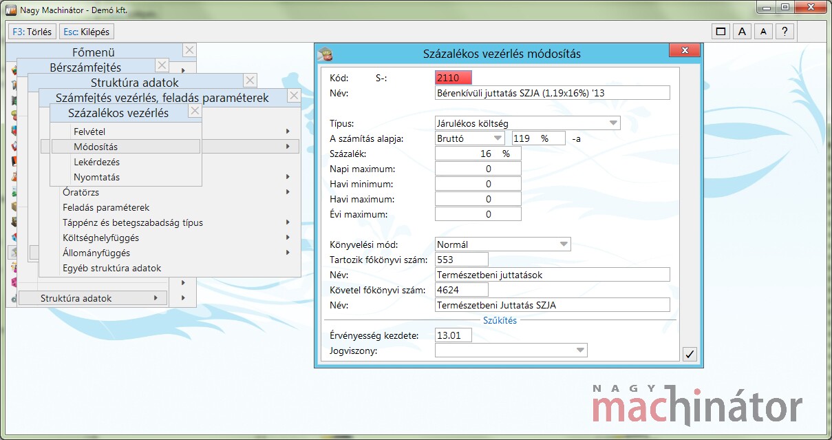 A bérjegyzék nyomtatásához meg kell adni, hogy milyen százalékos vezérlésekre leszámfejtett összegeket kell a bérjegyzék alján részletezni. Pl.: S92*+S8000+S8010+S115* |