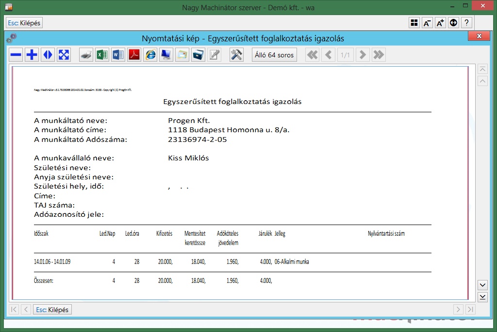 A egyszerűsített foglakoztatás igazolás funkció a munkavállalók időszaki teljesítését tartalmazó igazolást nyomtat.