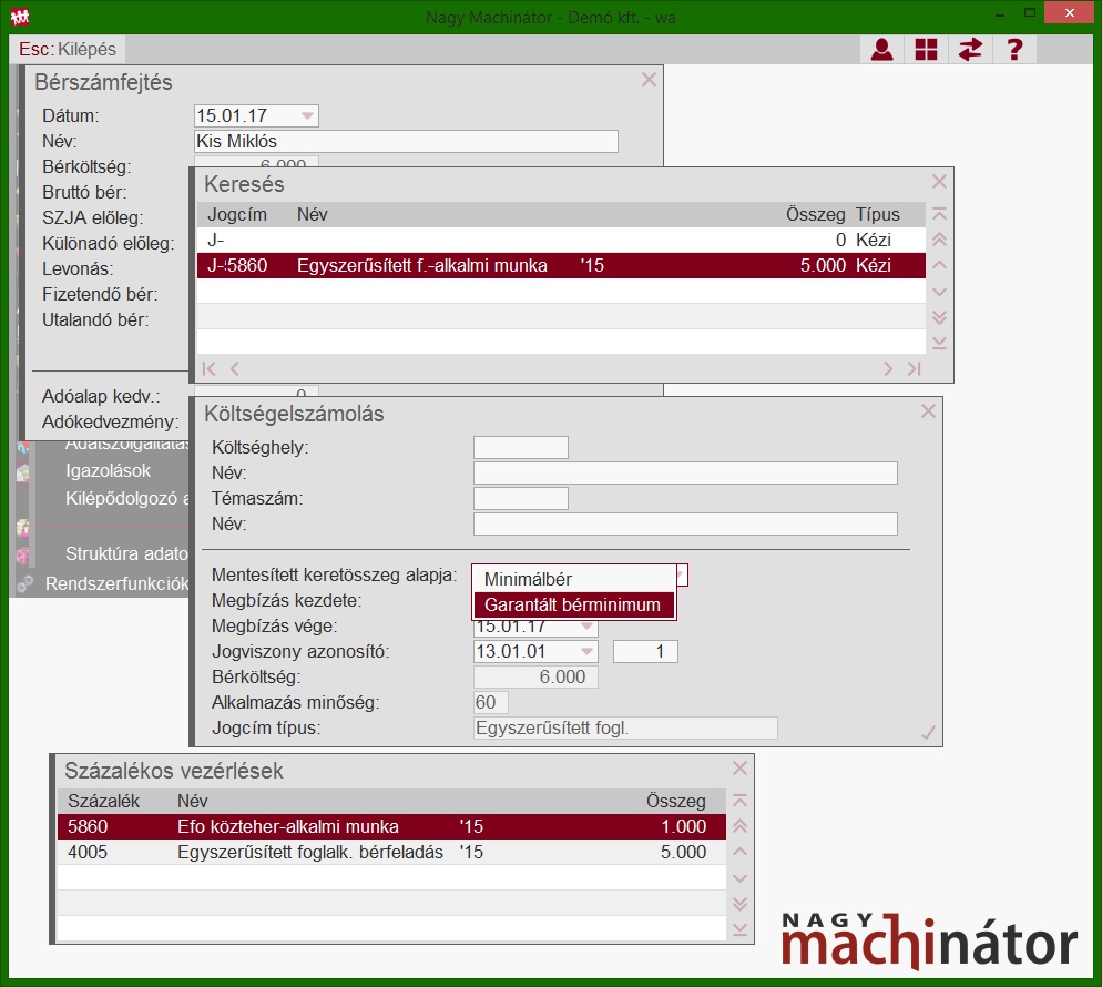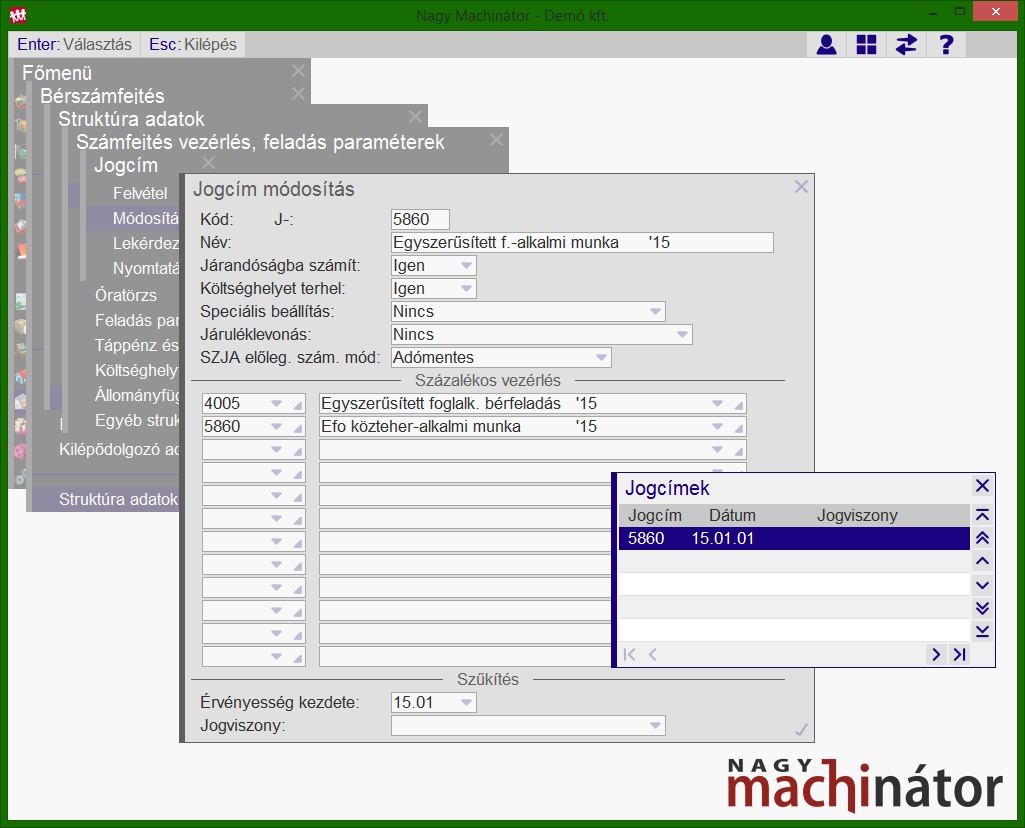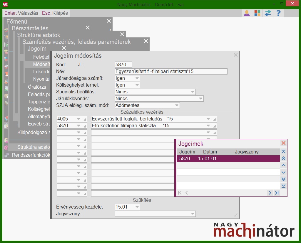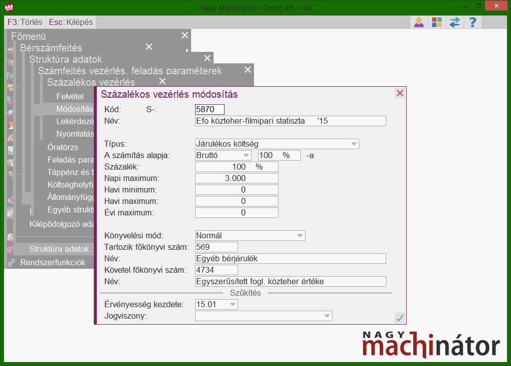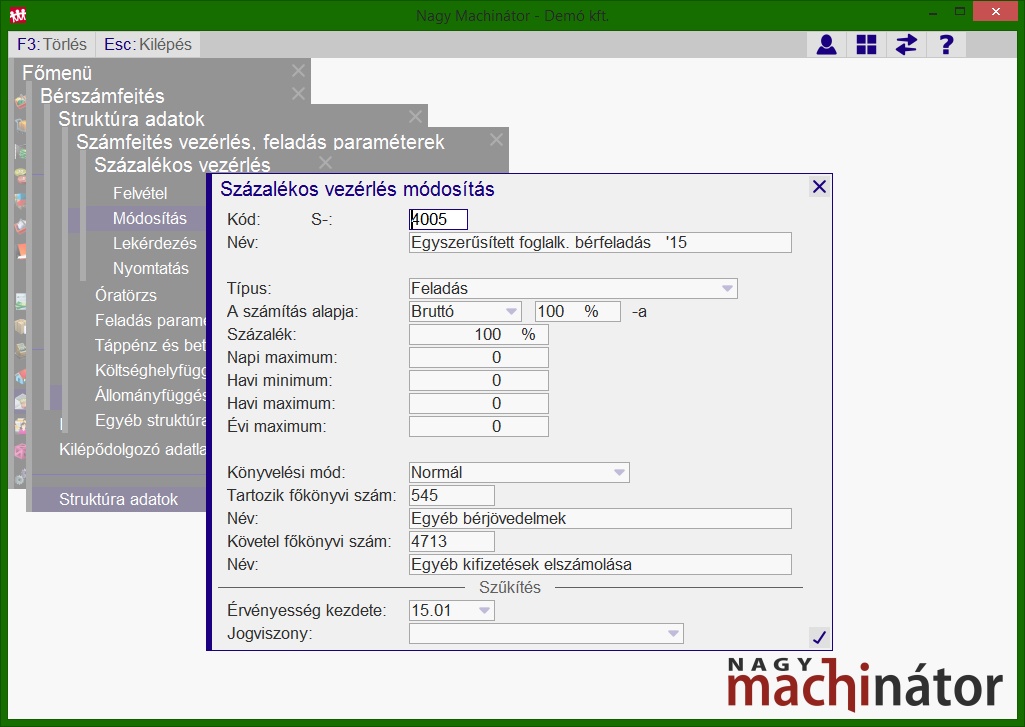 Az egyszerűsített foglalkoztatás jogcímekben szereplő feladás típusú százalékos vezérlések eltérnek a munkavállalók bérénél használatos feladás típusú százalékos vezérlésektől, így igény szerint külön főkönyvi számon lehet nyilvántartani az egyszerűsített foglalkoztatásból eredő bért és közterhet. A központi százalékos vezérlések és jogcímek a topic alján találhatóak. A százalékos vezérlésekben a kontírozás módosítható, frissítéssel nem kerül felülírásra.