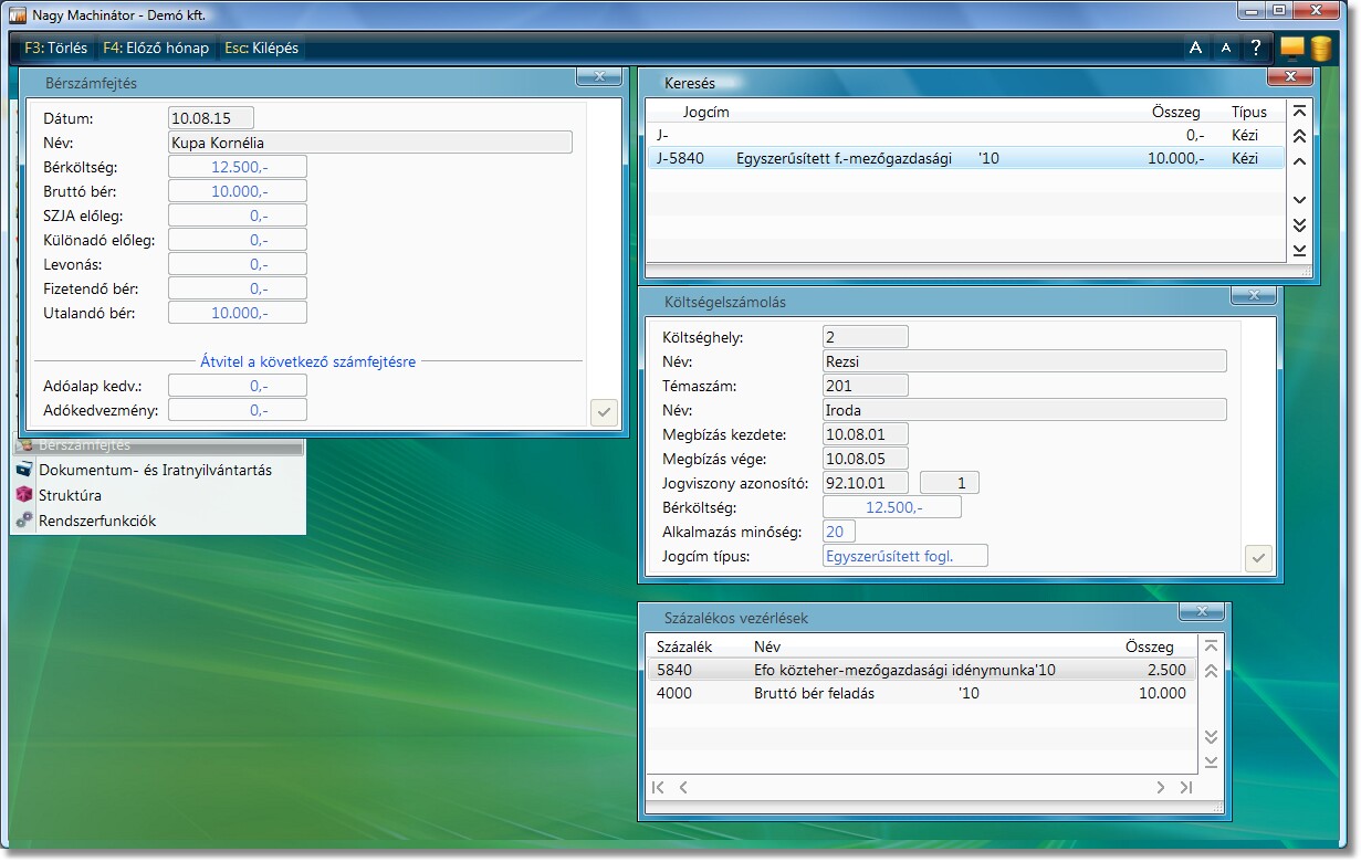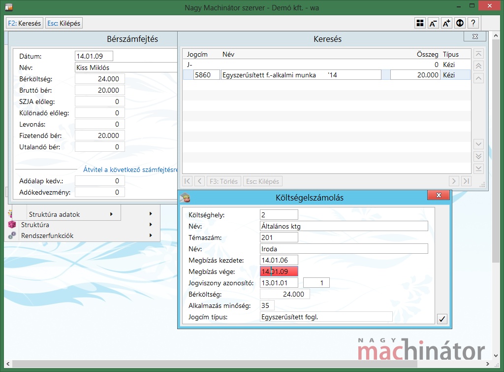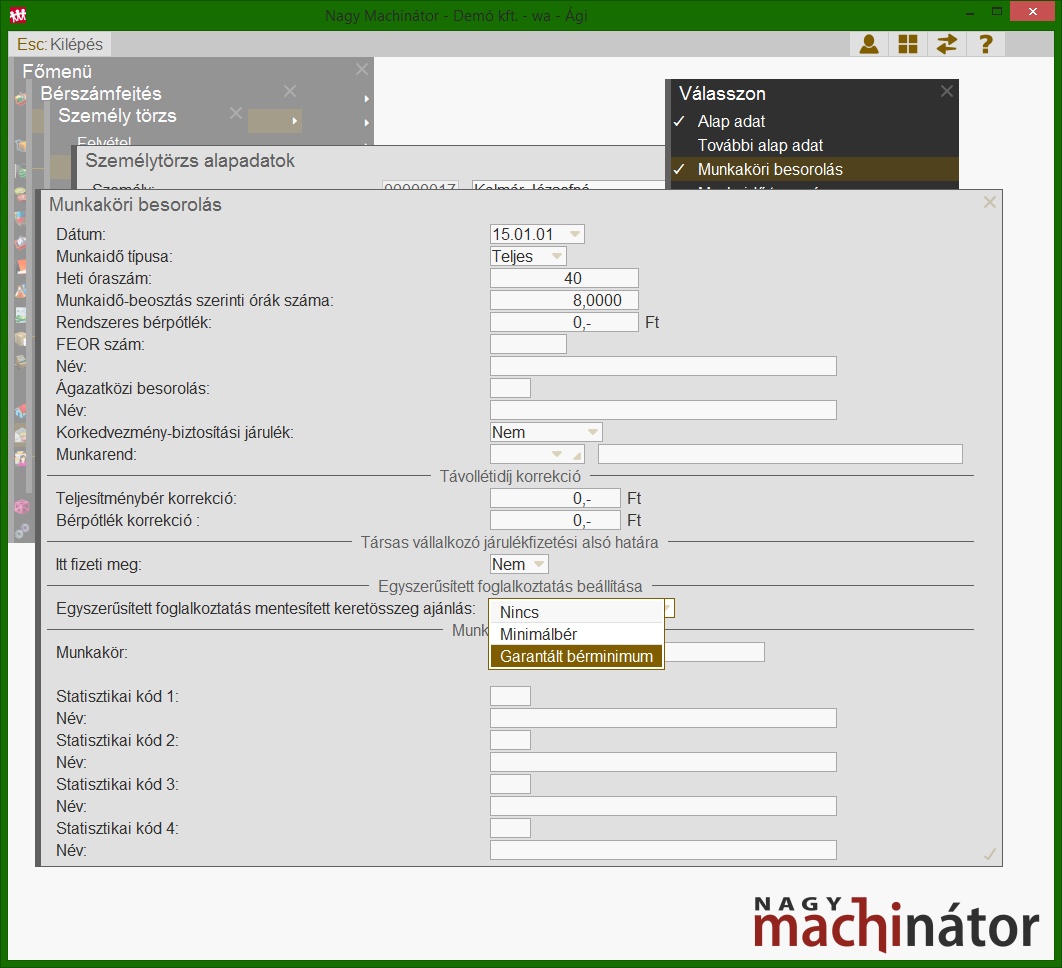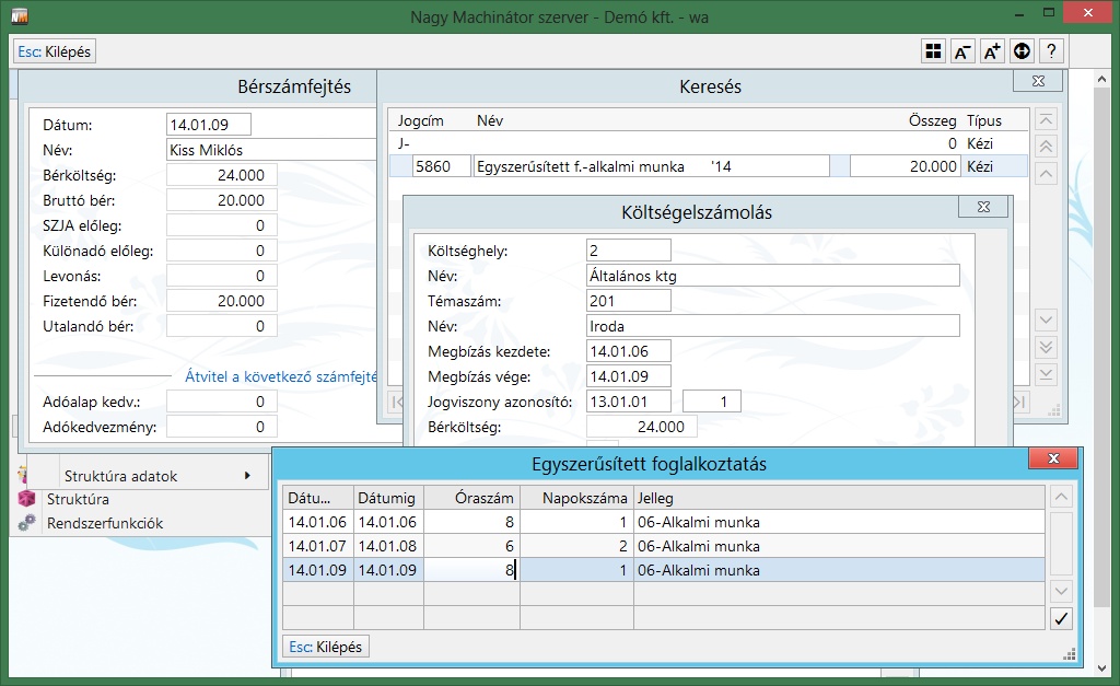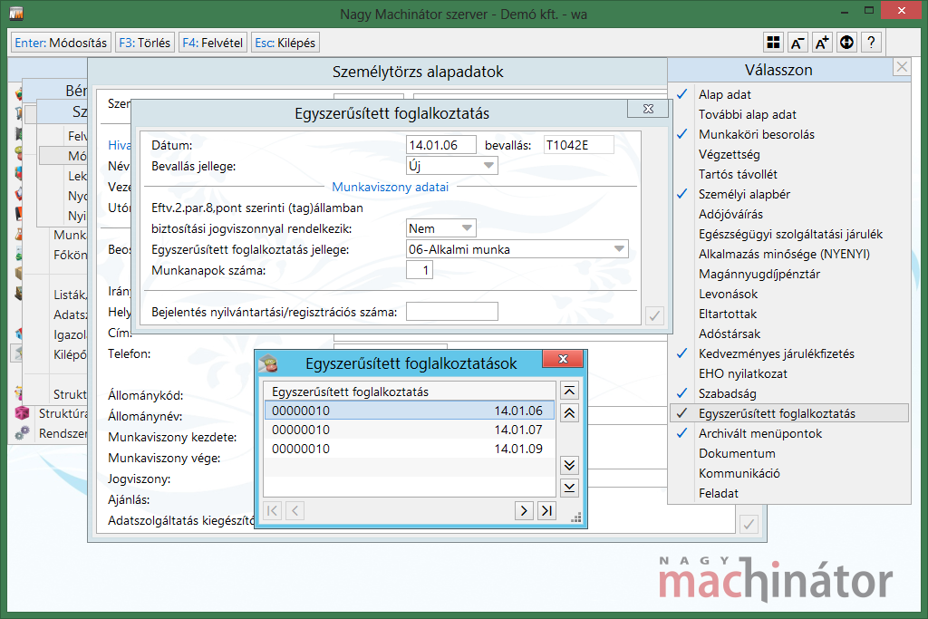 Az egyes időszakok rögzítése után megtörténik a számfejtés, és a személy törzs/egyszerűsített foglalkoztatás menüpont kitöltésre kerül: