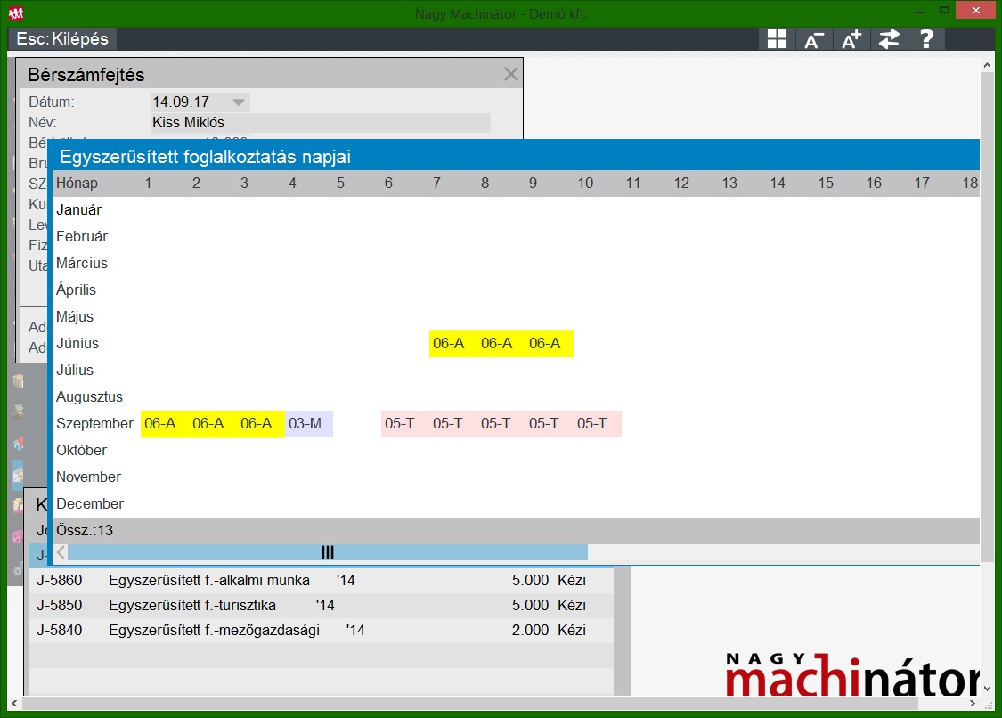 A törvény szerinti nap korlátok (alkalmi munka esetén max. 5 egybefüggő nap, egy hónapban max. 15 nap, stb) betartását, figyelését segíti az F5: EFO-s számfejtések funkciógomb. Ennek hatására egy hónapra és napra lebontott táblázatot látunk, amely havonta, alkalmazás típusonként összesíti a ledolgozott napokat, valamint a hónapok után egy éves összesítést is találunk. A táblázatban már az aktuális hónapban felvett napok is látszanak.