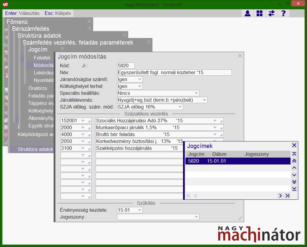A normál közteherviselés számfejtését a J5820 jogcímmel kell végrehajtani. Mivel ez a jogviszony nem tekinthető főfoglalkozásúnak, az SZJA előleg számítási módban Főfoglalkozású nem rendszeres érték került beállításra. Amennyiben az várható, hogy a Machinátorban lesz az összes járandósága leszámfejtve, azt ajánljuk, hogy a Személytörzs / SZJA nyilatkozat / Nem rendszeres menüpontban vegyék fel Főfogl. nem rend (opt.) értéket. Ebben az esetben az Apehhez bejelentett algoritmussal lesz az SZJA előleg meghatározva.