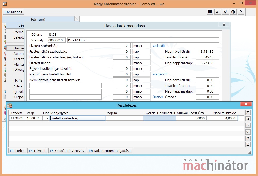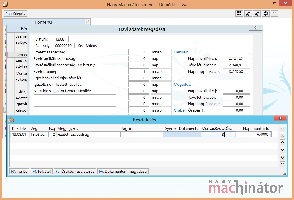 Amennyiben az MT 124§ (2) szerinti értéket választjuk, akkor a havi adatok bevitele során a részletező adatoknál a Napi munkaidő órszáma egyenlő lesz a a Munkaidő besosztás szerinti munkaidő óráinak a számával, és a kiadott szabadság napokban kerül feltűntetésre a bérjegyzéken.