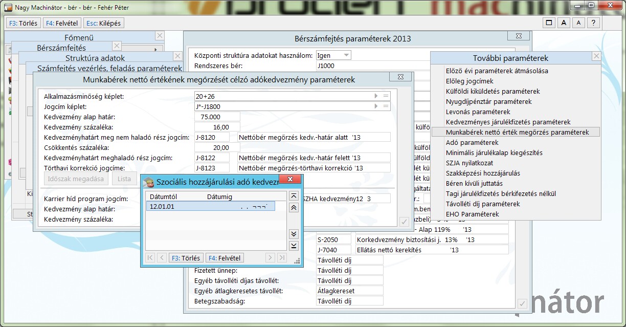 2013 előtt a program akkor fogja a szociális hozzájárulási adó kedvezményét minden munkaviszonyban dolgozónak számfejteni, ha a Számfejtés paraméterek / Munkabérek nettóérték megőrzés paraméterek menüpontban megjelenő ablakban található Időszak megadása funkció elindítása után megadják azt az időszakot, amelyre vonatkozóan a törvényi feltételeknek megfelelnek.
