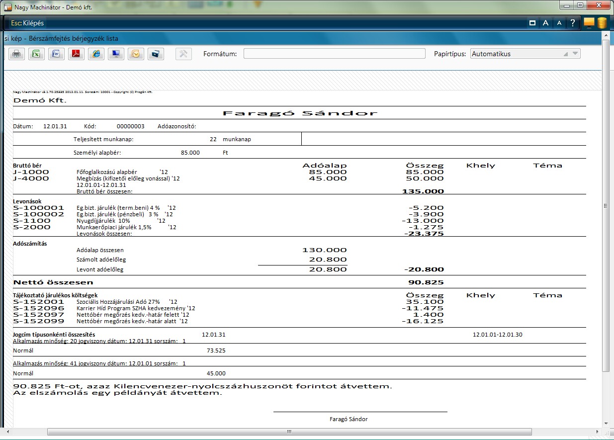 Az fenti bérjegyzéken az látható, hogy a program a kedvezmény kiszámításánál csak a munkaviszonyra tekintettel kapott összeget veszi figyelembe a részkedvezmény meghatározása során (a megbízást figyelmen kívül hagyja.)