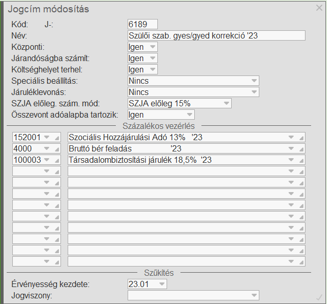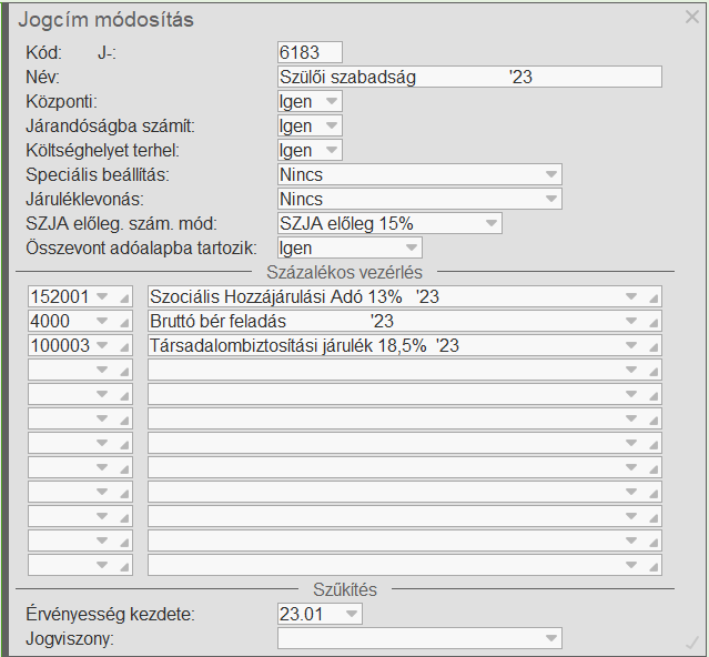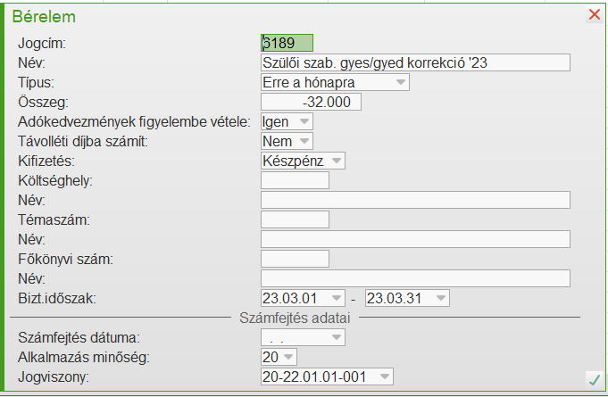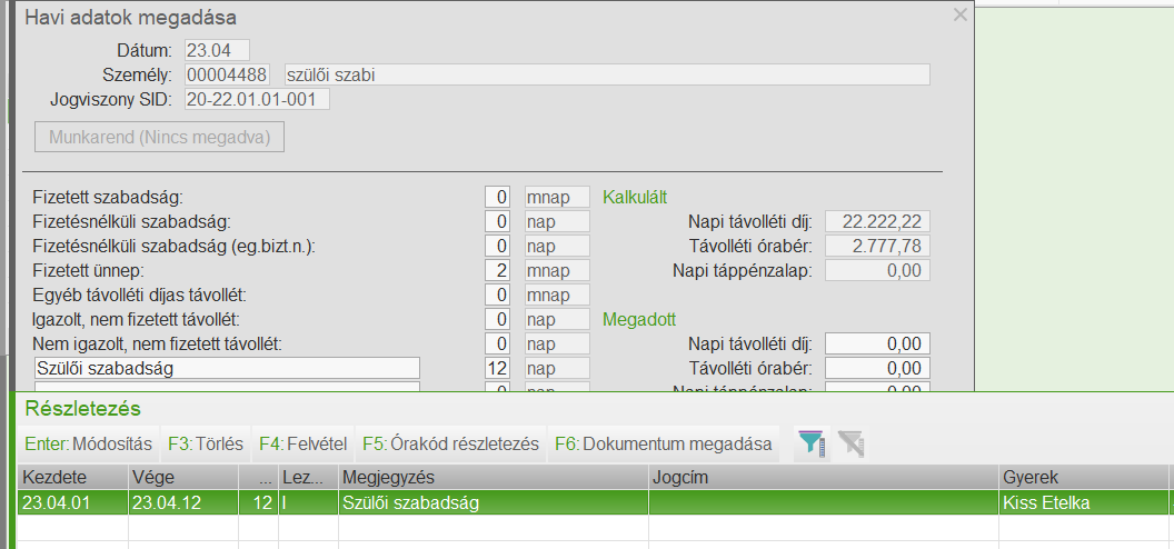 Abban a hónapban, amikor a szülői igénybe veszi ezt a szabadságot, akkor a Havi adatok naprészletezőjébe kell a távollétet felrögzíteni. A távollétre a távolléti díj 10%-a jár, csökkentve a gyes, gyed arra a napra eső összegével. Mivel a programban nem áll rendelkezésre sem a gyes, sem a gyed összege, így egy külön jogcímen (J6189) kell a felhasználónak rögzítenie a megfelelő összeggel. A J6189-es jogcím összegét egy összegben a szülői szabadság napjaira, negatív előjellel kell felvenni.