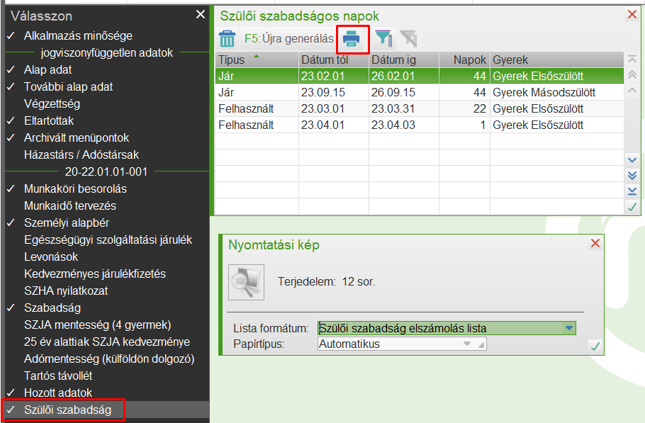 A szülő szabadság menüpontban F7: Nyomtatással hívható elő a központi listaforma.