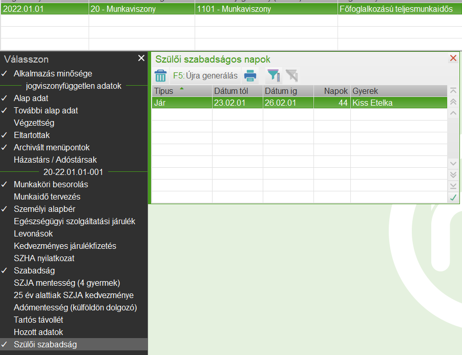 Ahhoz, hogy a program figyelje az szülői szabadságot, a gyermek születésekor a Személytörzs / Eltartottak menüpontban rögzíteni a kell a gyermeket a születési időpontjával együtt. Amennyiben a gyermek születésének időpontjában a szülő munkaviszonya már egy éve fennáll, akkor a program automatikusan legenerálja a járó szülői szabadságot az adott eltartottra. A generált és felhasznált szülői szabadságok a Személytörzs / Szülői szabadság menüpont alatt megtekinthetőek és list is nyomtatható.