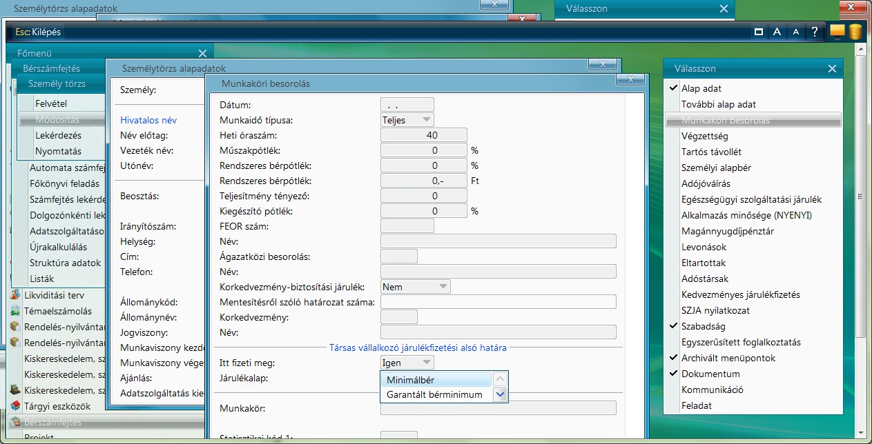 A Személytörzs funkció Munkakör almenüpontjában, a Társasvállakozó járulékfizetési alsó határa blokkban meg be kell állítani, hogy mi alapján kell a minimális járulékalapot meghatározni: Minimálbér | Garantált bérminimum