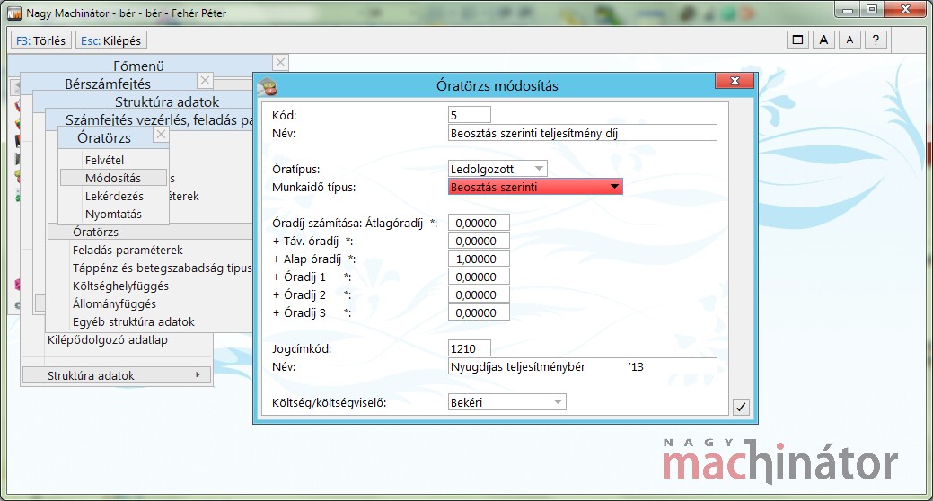 Óradíjas dolgozó esetén a bérelemként megadott olyan órakódok alapján számolja ki a program, amelyek Beosztás szerinti munkaidőben történtek és nem teljesítmény díjazásnak számítanak és nem bérpótlék.
