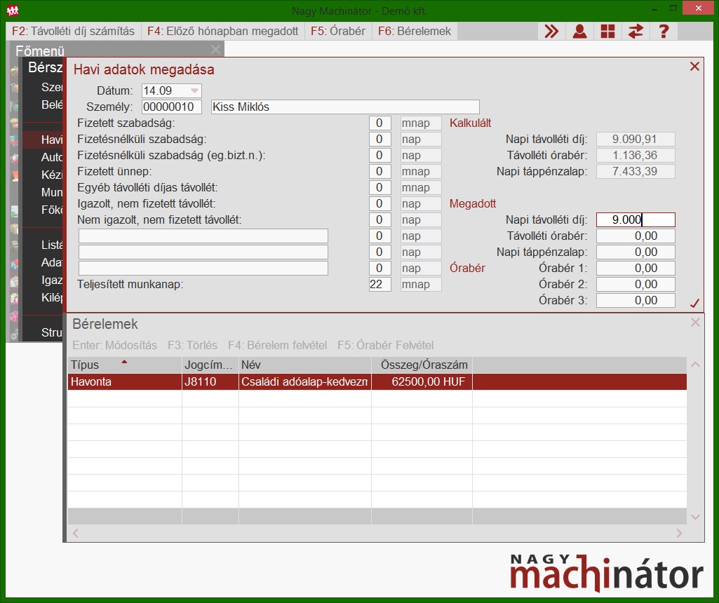 Ezt az adatállományt a Havi adatokból meg lehet tekinteni. A Távolléti óradíj mezőre kell állni és F2-t nyomni.