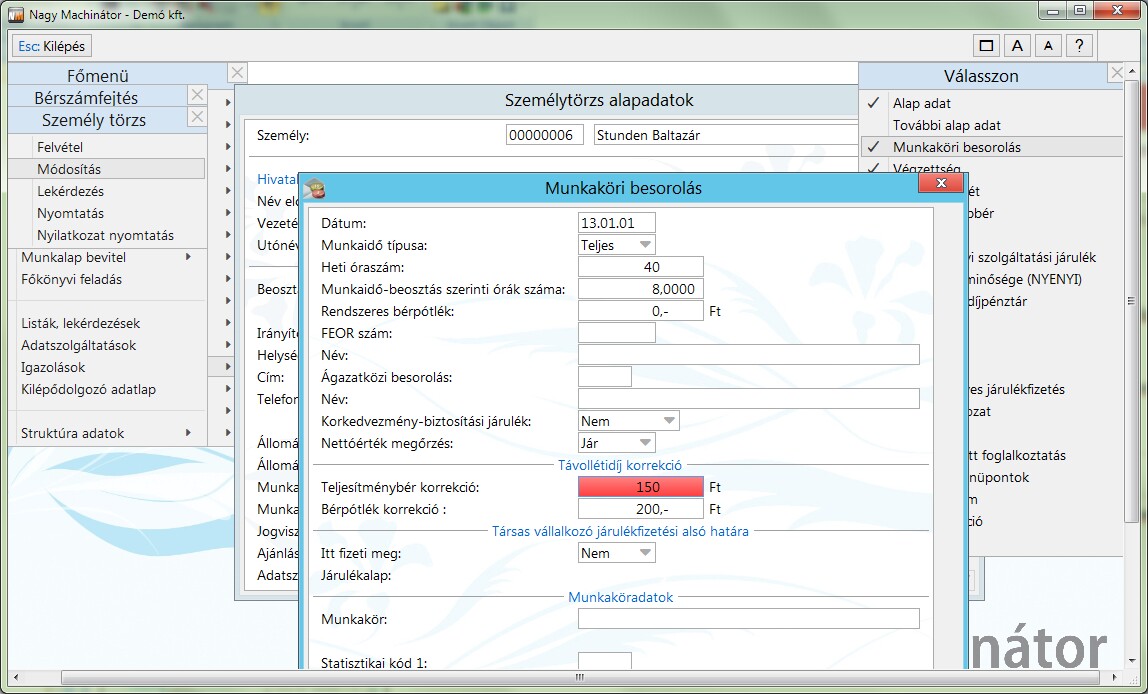 A Személytörzs / Személyi alapbér menüpontban lehet beállítani, hogy minek tekintsük a dolgozót a távolléti díj számítása során:
