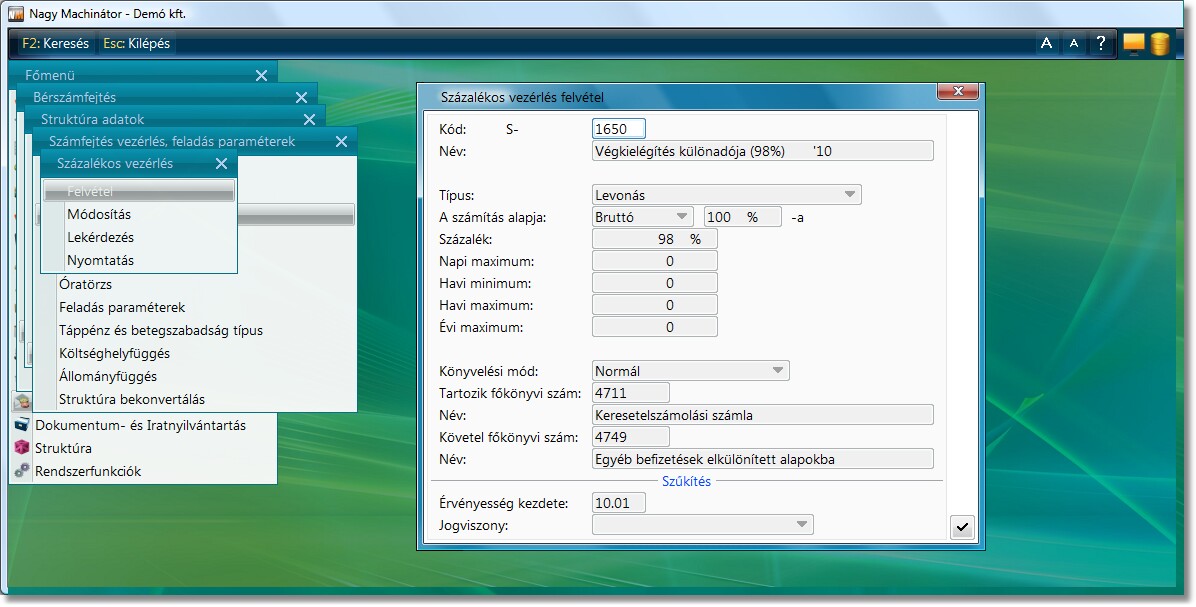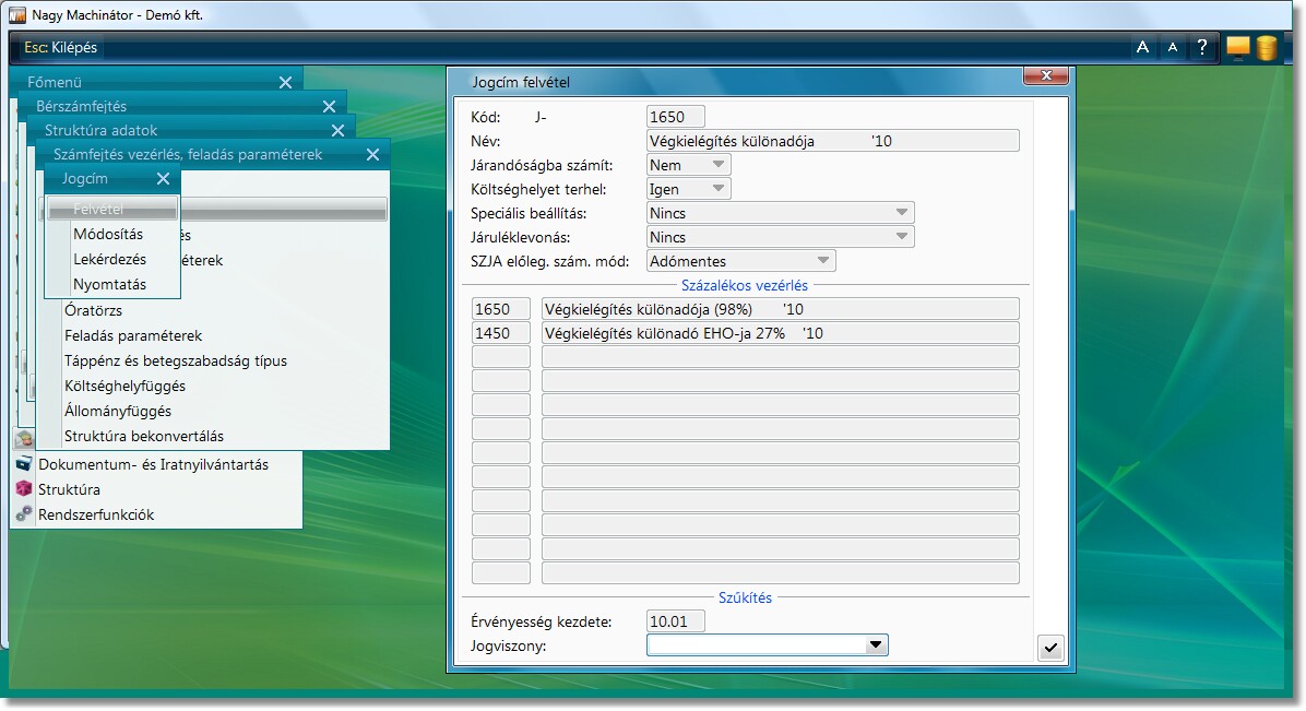 Létre kell hozni az alábbi százalékos vezérléseket és jogcímeket.