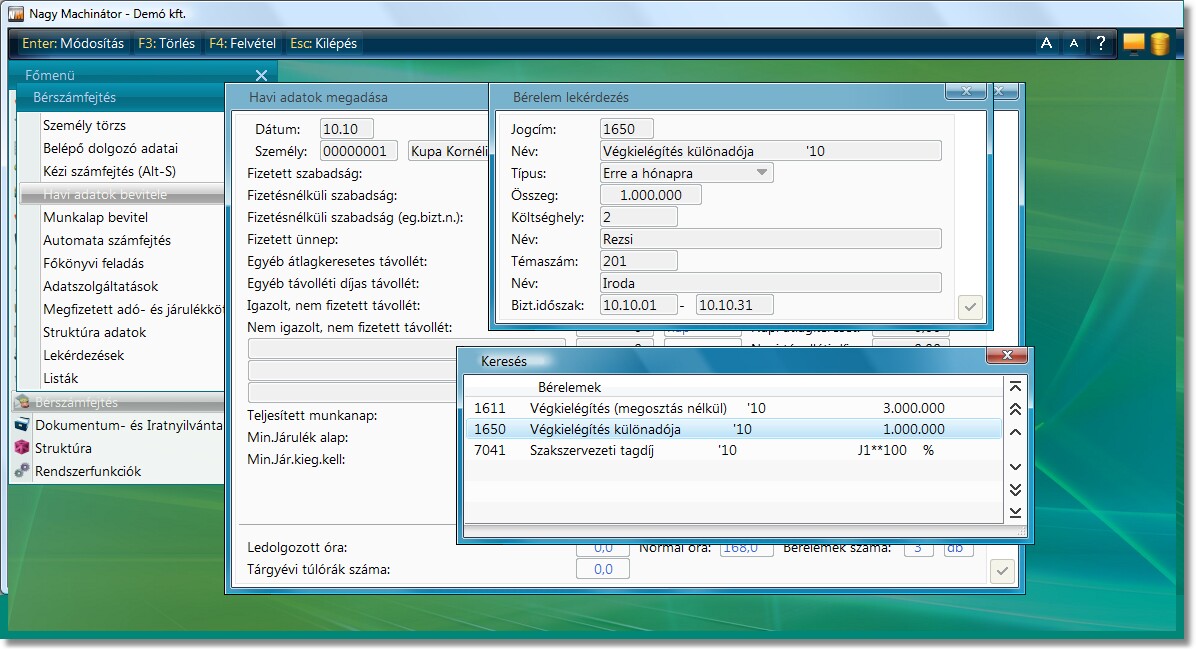 A havi adatok megadása során a Végkielégítés jogcímén kívül a különadó alapjának összegét Bérelemként kell felvenni a J1650 jogcímre.