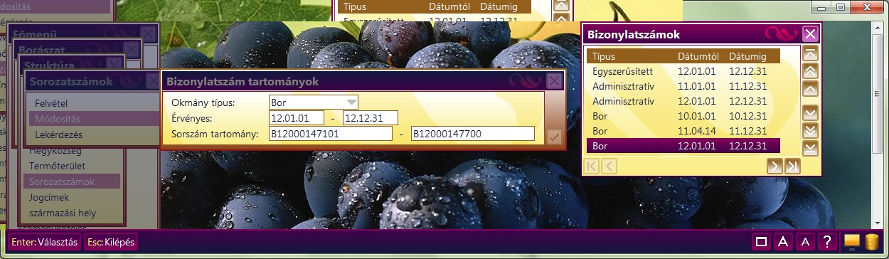 Mázsajegy / Egyszerűsített / Adminisztratív / Bor A megfelelő típus kiválasztásával az adott (saját típusú) bizonylatra kerül rá a sorozatszám. |