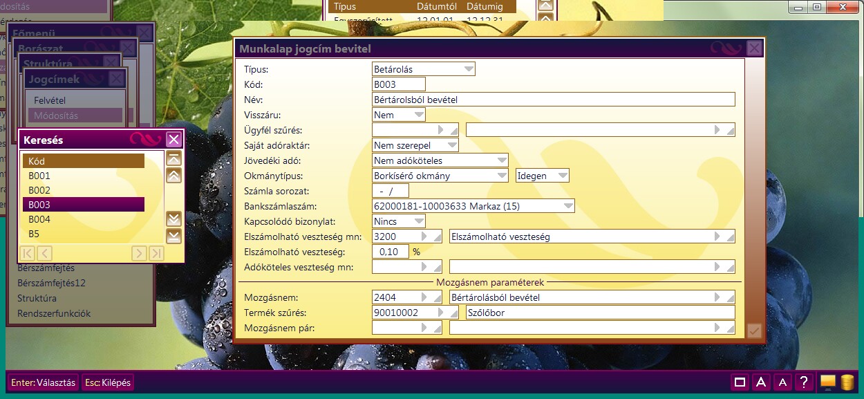 Az egyes pincei mozgásokat az itt megadott munkalap jogcím struktúrában tudjuk beparaméterezni. A bor modul a készlet modullal szoros összefüggésben van, az egyes munkalapok rögzítése során az itt beállított mozgásnemek szerint kezeli a készletet.