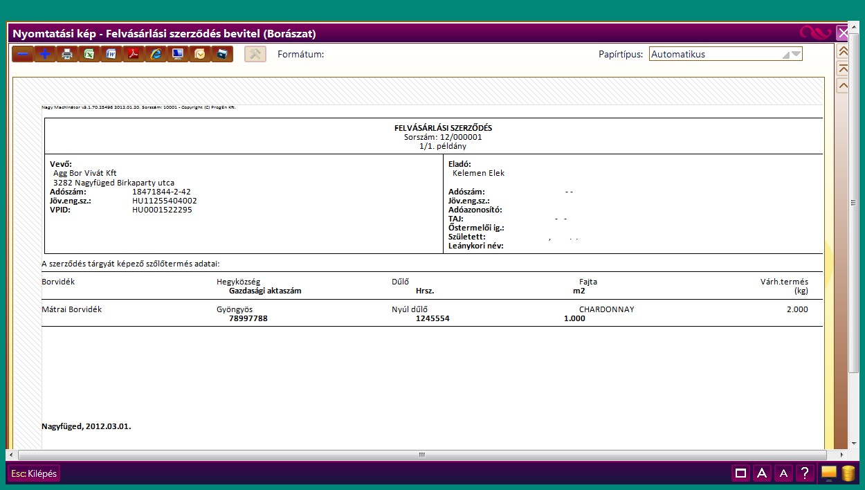A szerződés rögzítése után lehetőségünk van a Szerződés kinyomtatására is.