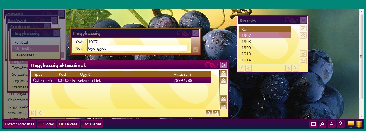 Mielőtt valakivel Felvásárlási szerződést kötünk, rögzíteni kell az Őstermelőnek (vagy Ügyfélnek) a Hegyközségtől kapott Aktaszámát a rendszerbe.