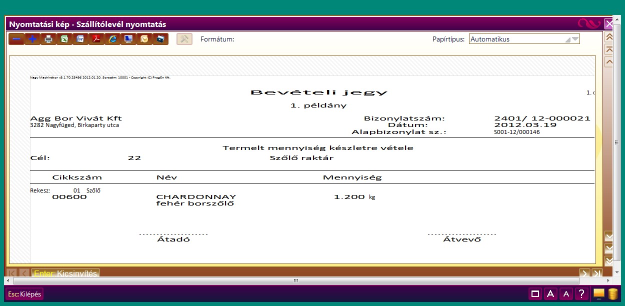 A tétel felvétel után a Lezárás, nyomtatás menüpont elindítása szükséges. Itt a program fel fogja ajánlani a Jogcímben definiált bizonylat típusok kinyomtatását.