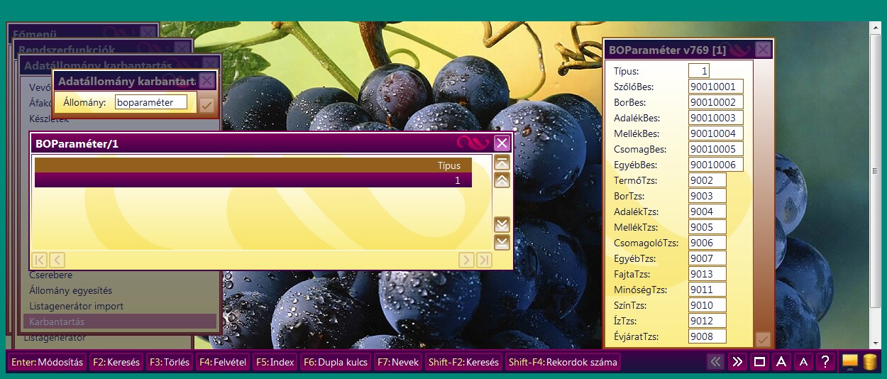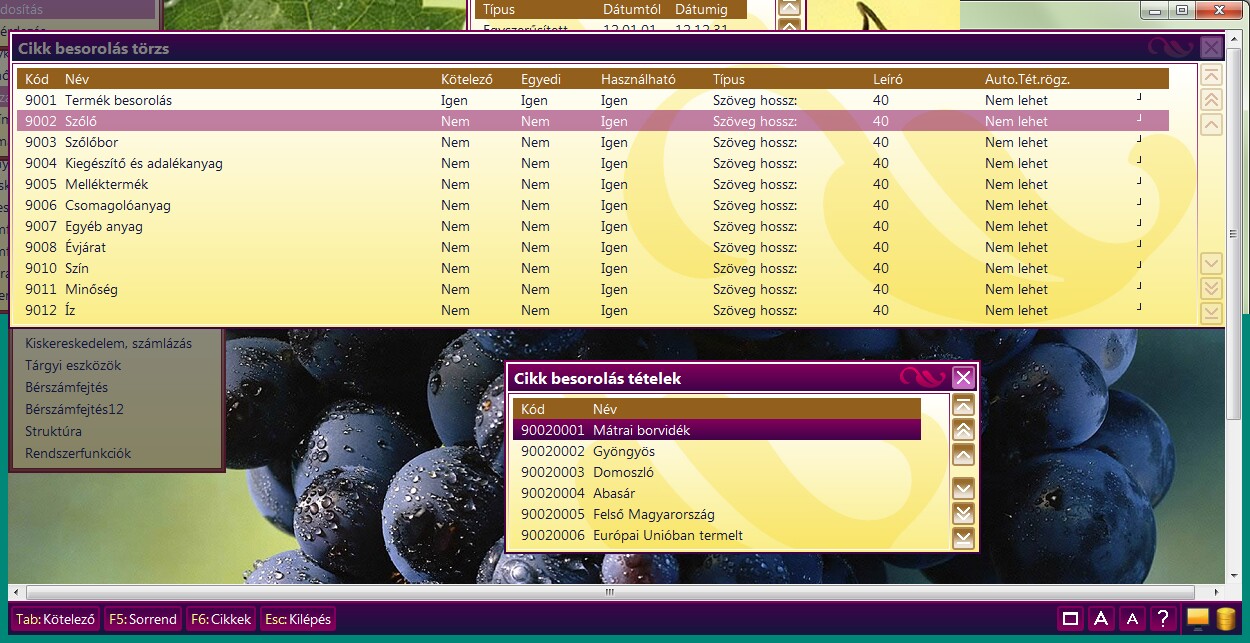 A struktúra beállítást a borászati modulban azzal kell folytatni, hogy meg kell adnunk a termőterületet a hozzá tartozó hegyközséget és származási helyet, helyrajzi számot az adott szőlő fajtáját a termőterületen továbbá a terület méretét. A munkalapok mellett készülő okmánytípusok sorozatszám tartományát is rögzítenünk kell a hozzá tartozó érvényességgel, hiszen ez alapján készülnek majd a rögzített okmányok a nyilvántartásunkban.
