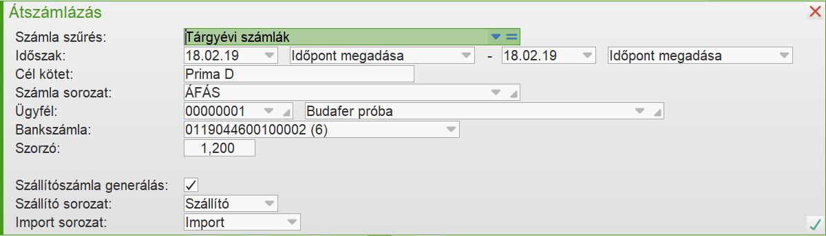 Amennyiben a célkötetben a megadott számlasorozatra van számlaparaméter és az kontírozva van, a létrejött számlák a paraméterből kapják a kontírszámot. Ugyanez igaz a forráskötetben a szállítószámlákra is.