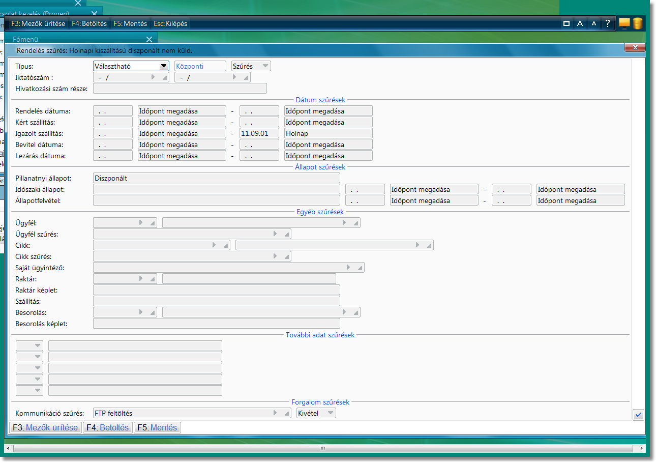A szűrésben érdemes az igazolt szállítás dátumára, Diszponált állapotra és az FTP feltöltés meg nem történtére szűrni.