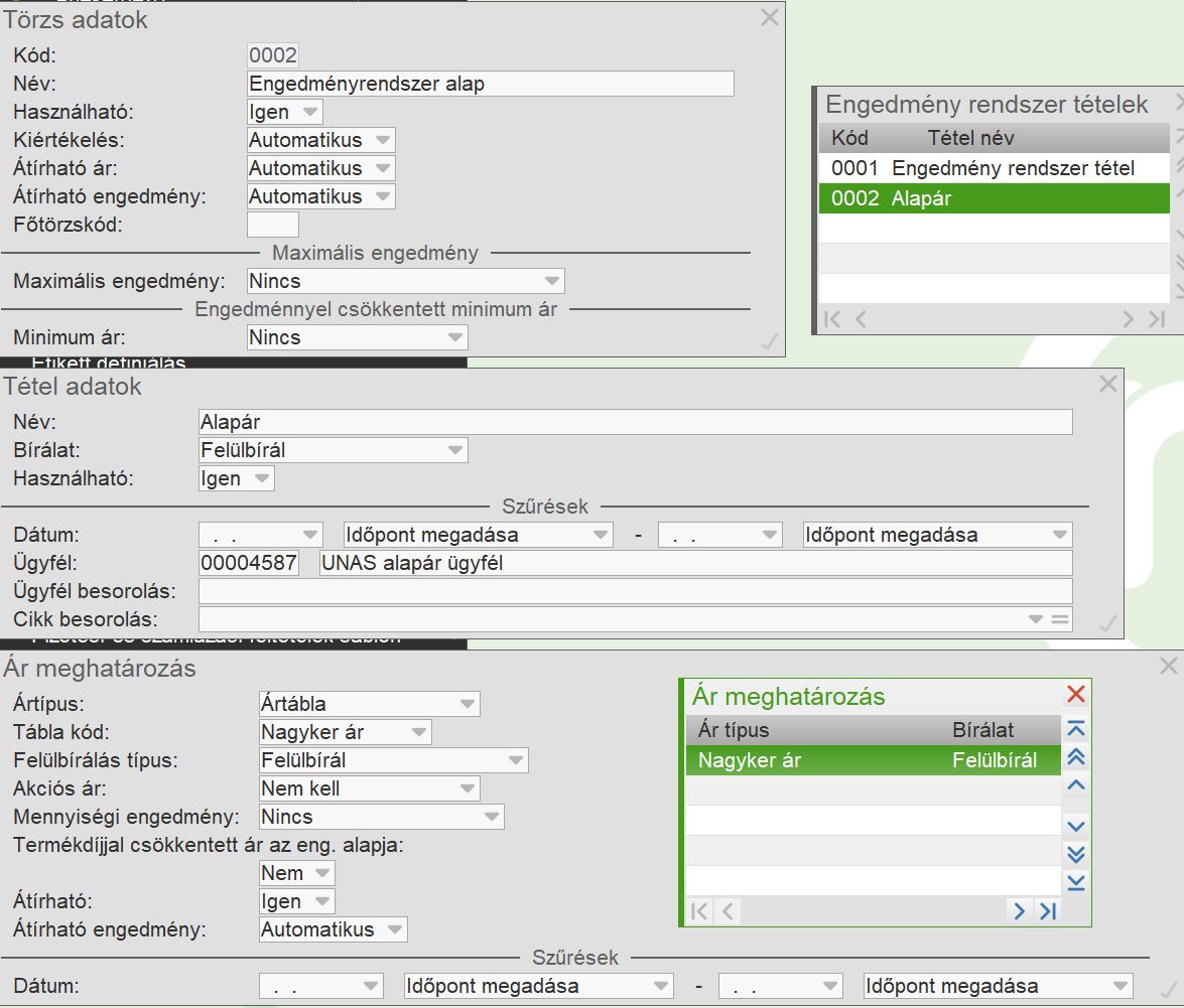 Nincs - az akciózott (érvényes) ár listaárként megy át és nem lesz akciós ár átadás. Ártábla - megadható egy ártábla és amennyiben erre az ártáblára az átadás idején érvényes akciós ára van a cikknek, az ártábla ár listaárként, míg az akciózott ár akciós árként kerül felküldésre. Ügyfélár - megadható egy "UNAS alapár ügyfél", akinek az engedményrendszerben kialakított egyedi, akciómentes árát adjuk át listaárként és a normál "UNAS ár ügyfél" érvényes árát akciós árként. Ez a megoldás kizárólag az új engedményrendszerrel állítható be megfelelően. Megjegyzés1: Akciós ár átadása csak akkor történik meg, ha az eltér a normál ártól, egyébként üres érték kerül átadásra. Megjegyzés2: Az akciós ár átadása (ha van) csak akkor biztosított, ha a Feltöltendő=Minden cikk beállítás érvényes, mivel az akciózás dátum tól-ig tarthat és a dátum szerint érvényes vagy nem érvényes akció jelenléte nem módosítja a cikktörzset, azaz az Utolsó feltöltés óta változott cikkek beállítással a dátum szerint megjelenő vagy lejáró akciózásról nem tudhat a feltöltés. Ugyanakkor ez a beállítás magas cikkszám esetén jelentősen terheli a szervert, így nem javasolt a sűrű (negyedóránkénti vagy félóránkénti) cikk adat átadás. Az Ügyfélár beállításhoz javasolt az alábbi engedményrendszert létrehozni: |