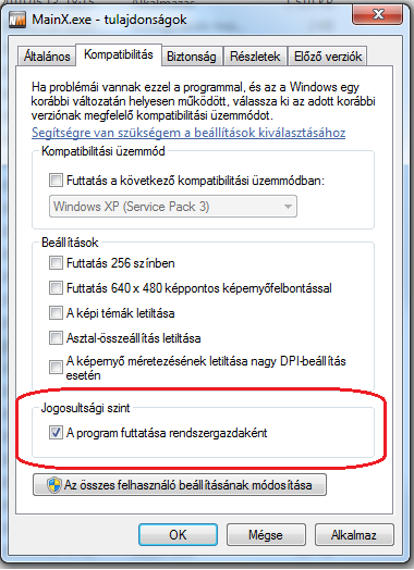 vagy a program - MainX.exe - tulajdonságainak Kompatibilitás lapján (Windows Vista-tól kezdve) beállítjuk A program futtatása rendszergazdaként módot.