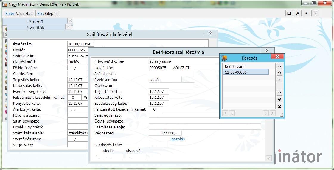 A Projekt / Kiadások lapon alvállakozónként rögzített adatok alapján lehet érkeztetni a számlát.