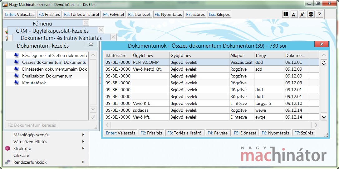 A Nagy Machinátor Dokumentum- és Iratnyilvántartás moduljának telepítése során automatikusan feltöltésre kerül a szűrésváltozatok kialakításának egy lehetséges változata. A szűrésváltozatok feltöltésével az volt elsődleges célunk, hogy különösebb paraméterezés nélkül a szűrésváltozat használatának lehetőségeit demonstráljuk.