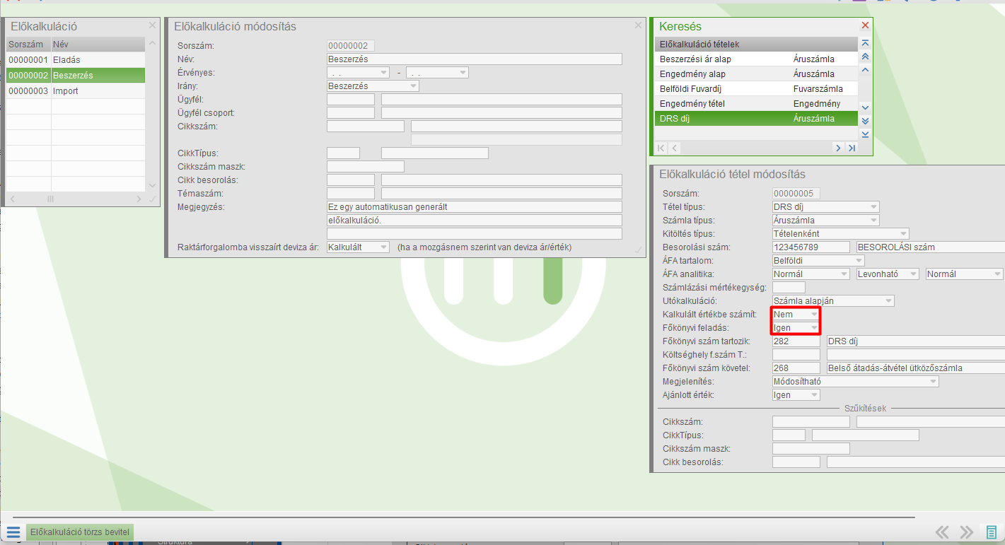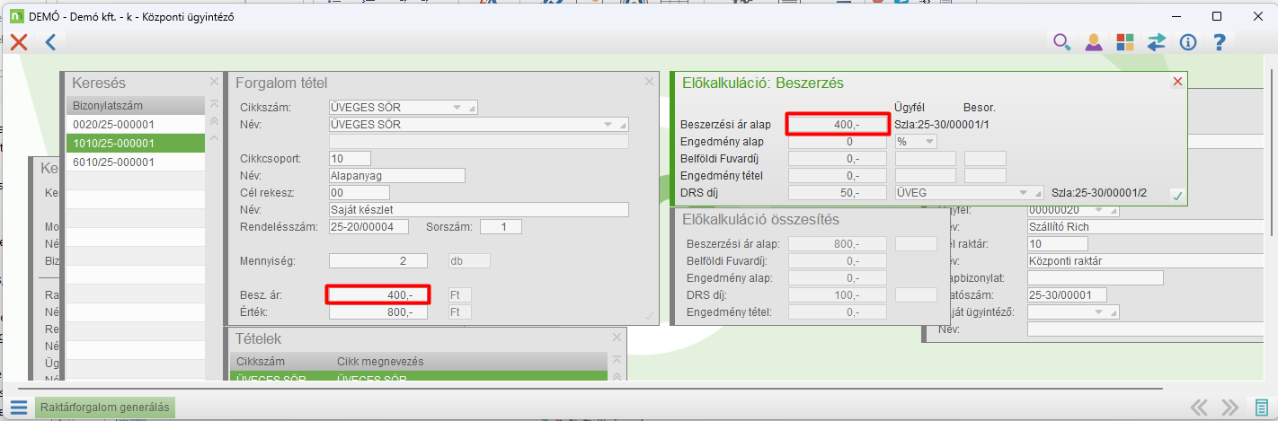 Hagyományos szállítólevél rögzítése során a DRS mint a beszerzett termékhez kapcsolódó előkalkulált költség altételeként jelenik meg.