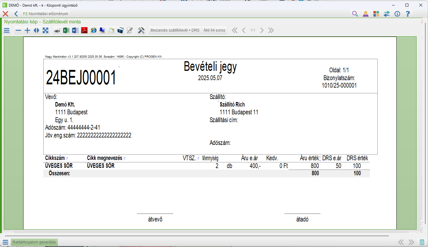 Az érték a termékhez kapcsolt DRS cikkszám alapján lett megajánlva, azonban ha a szállítólevélen vagy számlán más összeg szerepelne, beállítástól függően át lehet írni.
