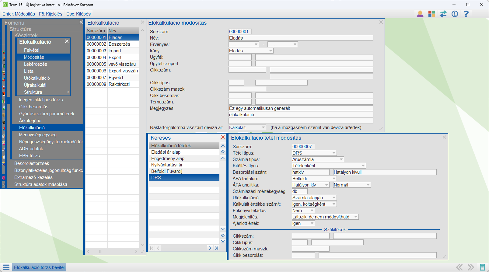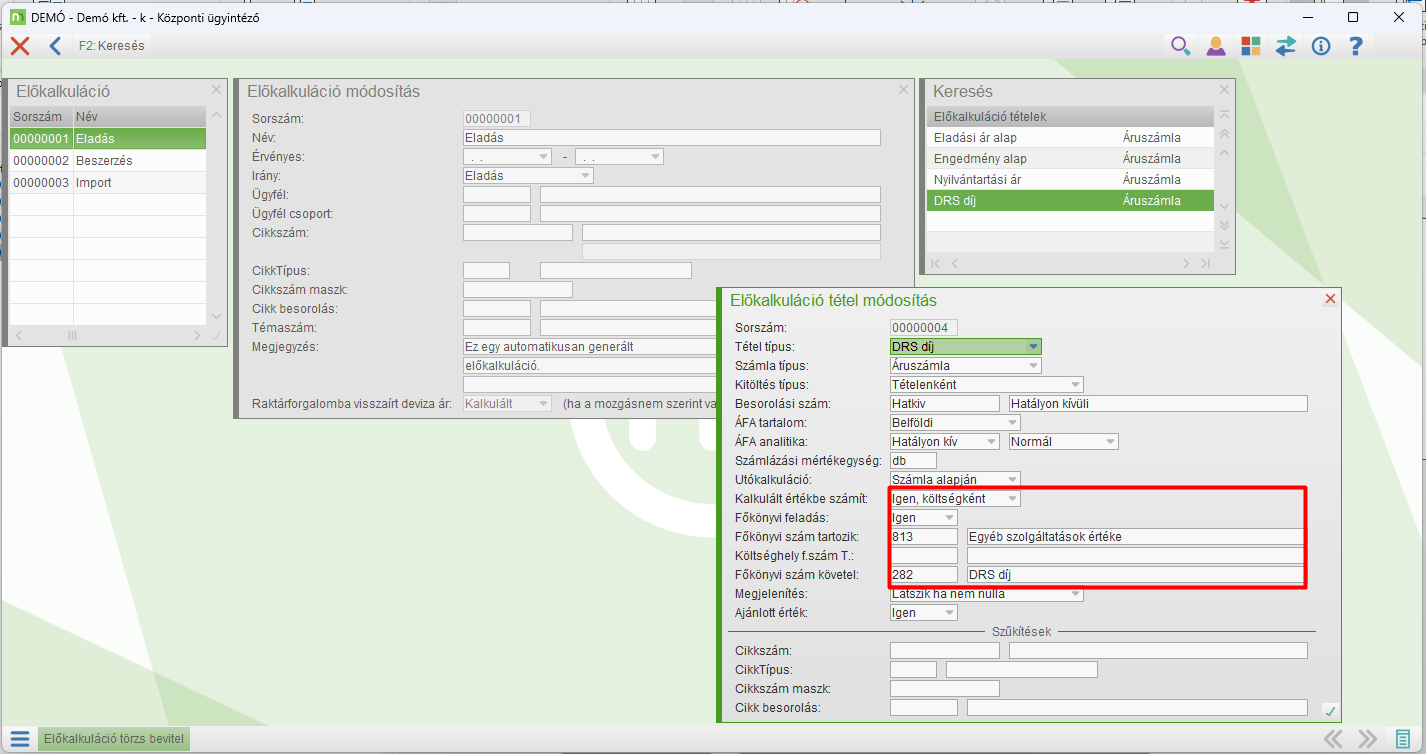 A DRS tétel az előkalkulációban jelenik meg. (lásd előző kép)