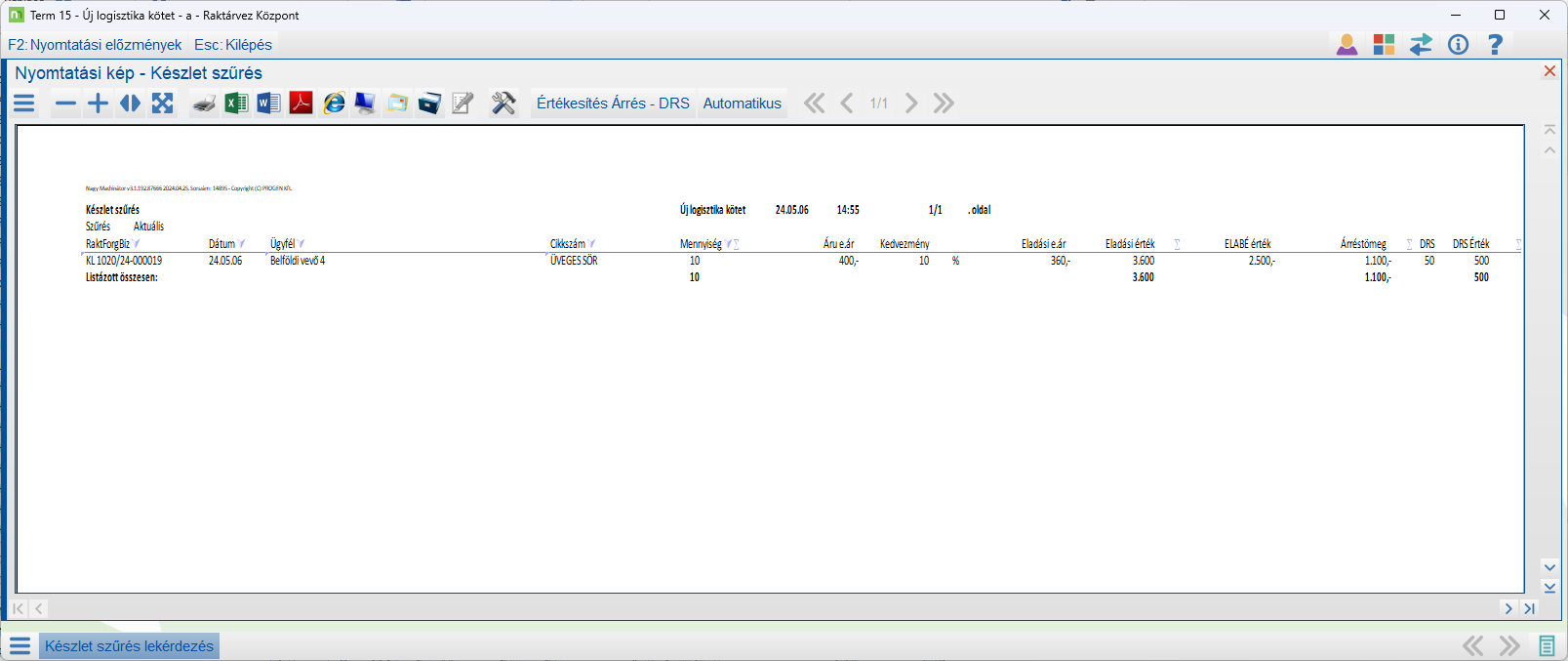 A Készlet szűrésfunkcióhoz készült egy listaforma (lásd kép), amely tételesen és összesítve is tartalmazza a DRS értékét, továbbá a DRS nélküli árrést is itt lehet lekérdezni.