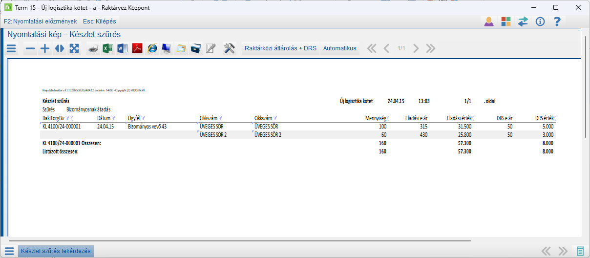 A Készlet szűrésfunkcióhoz készült egy listaforma (lásd kép), amely tételesen és összesítve is tartalmazza a DRS értékét.