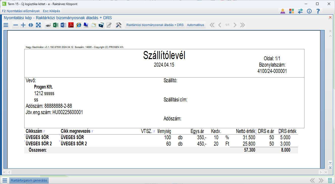 Amennyiben arra van igény, hogy raktárközi mozgás esetén az áru DRS tartalma is látható legyen a szállítólevélen vagy egy összesítő listában a következők szerint lehet eljárni.