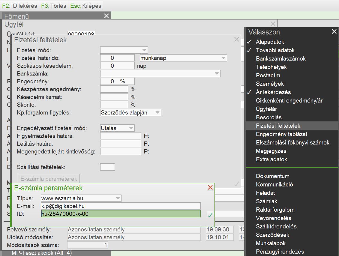 Ügyfél felvétel üzemmódban a hosszú név mellett található E-Számla.hu gombbal megkereshető az ügyfél az e-szamla.hu-n és rögzíthetők az adatai, valamint a Fizetési feltételek/E-Számla paraméterekbe bekerül a www.eszamla.hu típus, az email cím és az E-Számla.hu-n regisztrált ügyfél ID.