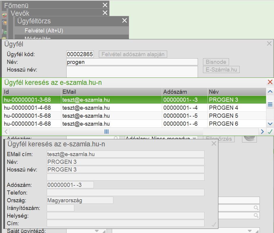 Ügyfél módosításban az ID-n F2-t nyomva, ha az ügyfél nem található meg az E-Számla.hu-n, akkor a program ajánlja a felvételét.