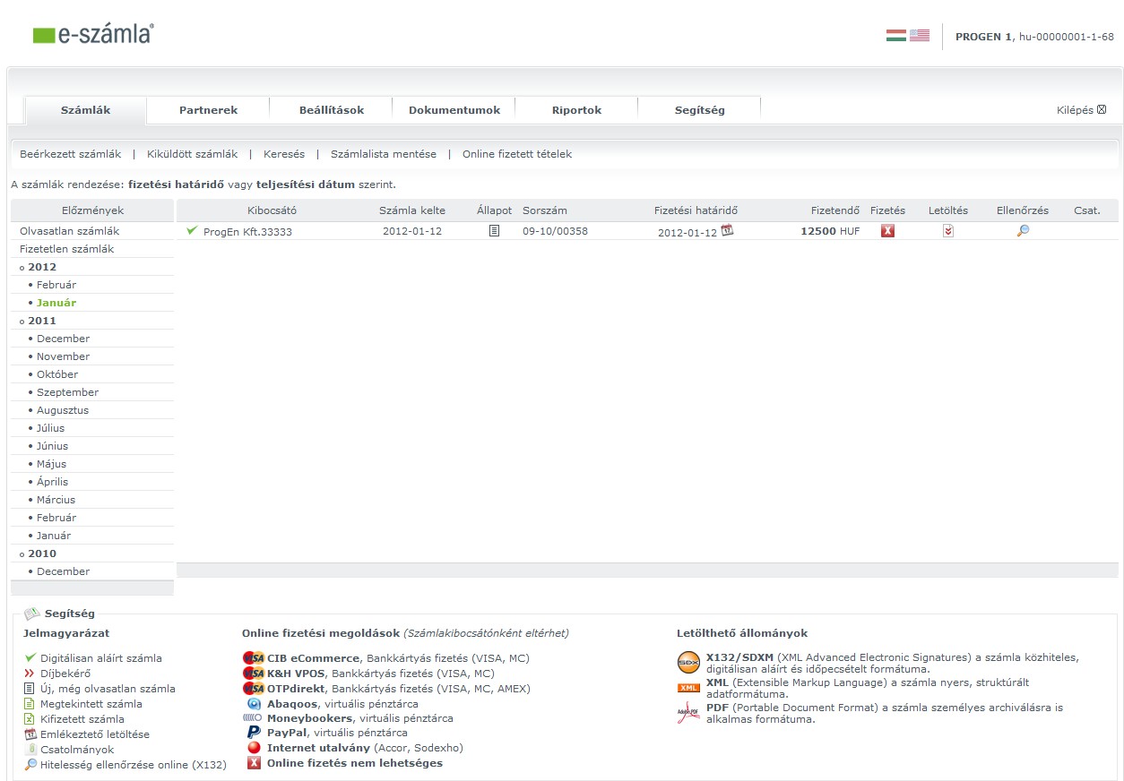 A szolgáltatóhoz felküldött elektronikus számlákat az alábbi képen látható felületről kérdezhetjük le: