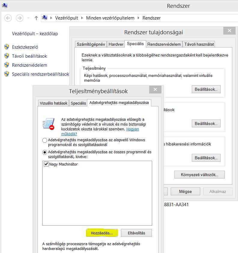 A Vezérlőpult/Rendszer/Speciális rendszerbeállítások/Teljesítmény/Adatvégrehajtás megakadályozása ablakban az Adatvégrehajtás megakadályozása az összes helyen, kivéve: kapcsolót kell bekapcsolni és a Hozzáadás gombbal be kell tallózni a Machinátor könyvtárából a Mainx.exe-t: