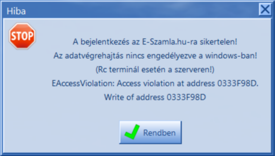 EAccessViolation hibát kapunk mind számla küldésnél, mind az ügyféltörzsben az ID kód generálásánál. Más operációs rendszereken nem merült fel hasonló probléma.
