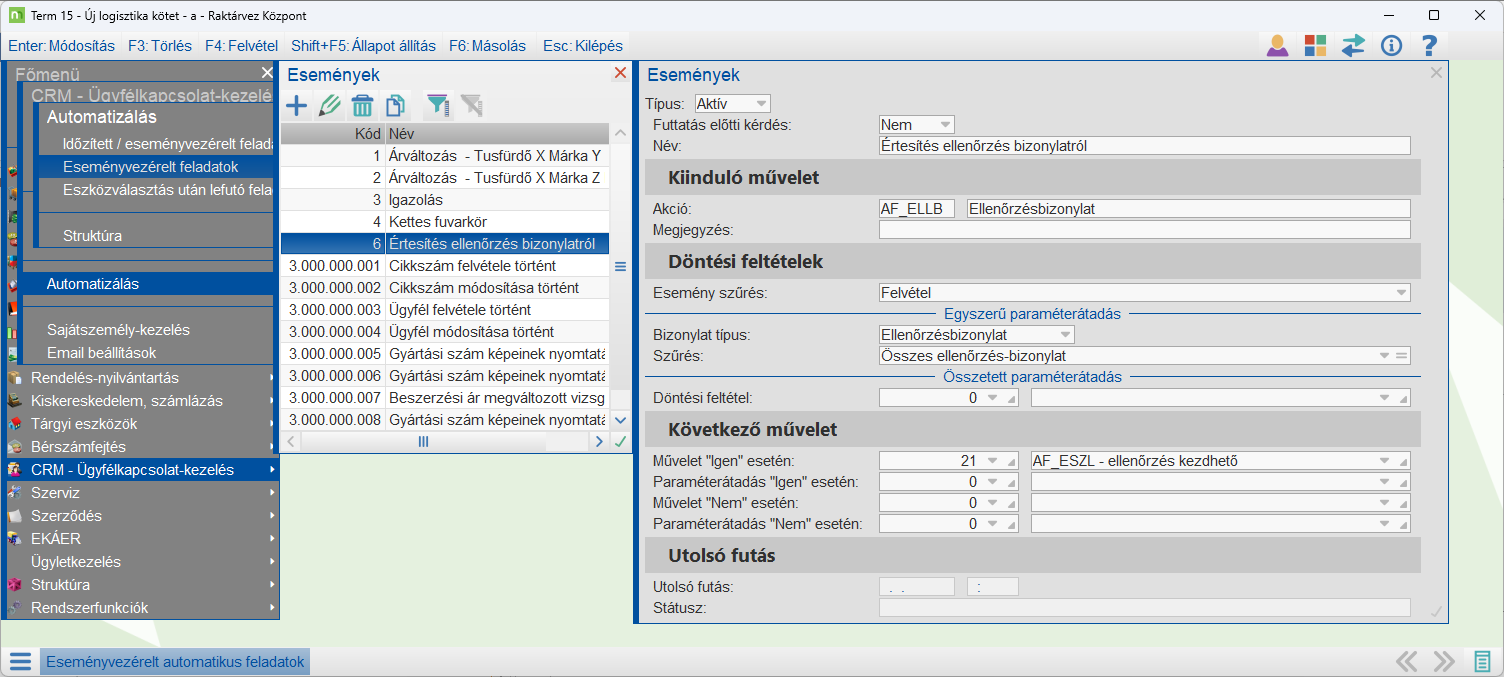 A beállítás azt jelenti, hogy amennyiben egy ellenőrzés bizonylatnak a felvétele megtörténik, le fogja futtatni a 21-es műveletet (Automatizált folyamatot).