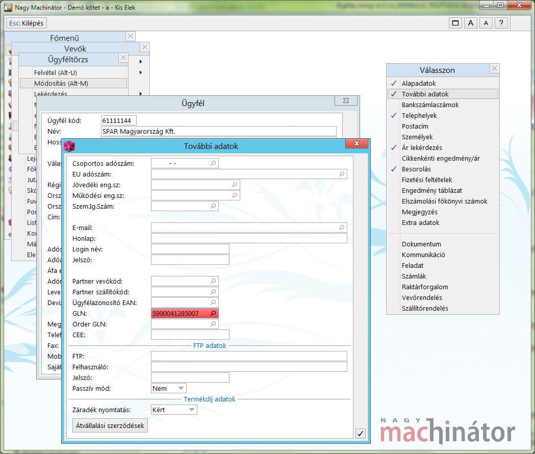 Az ügyfélazonosítás (NAD-BY szegmens EDI rendelés esetén) elsődlegesen a Ügyféltörzs / További adatok menüpont GLN mező alapján történik.