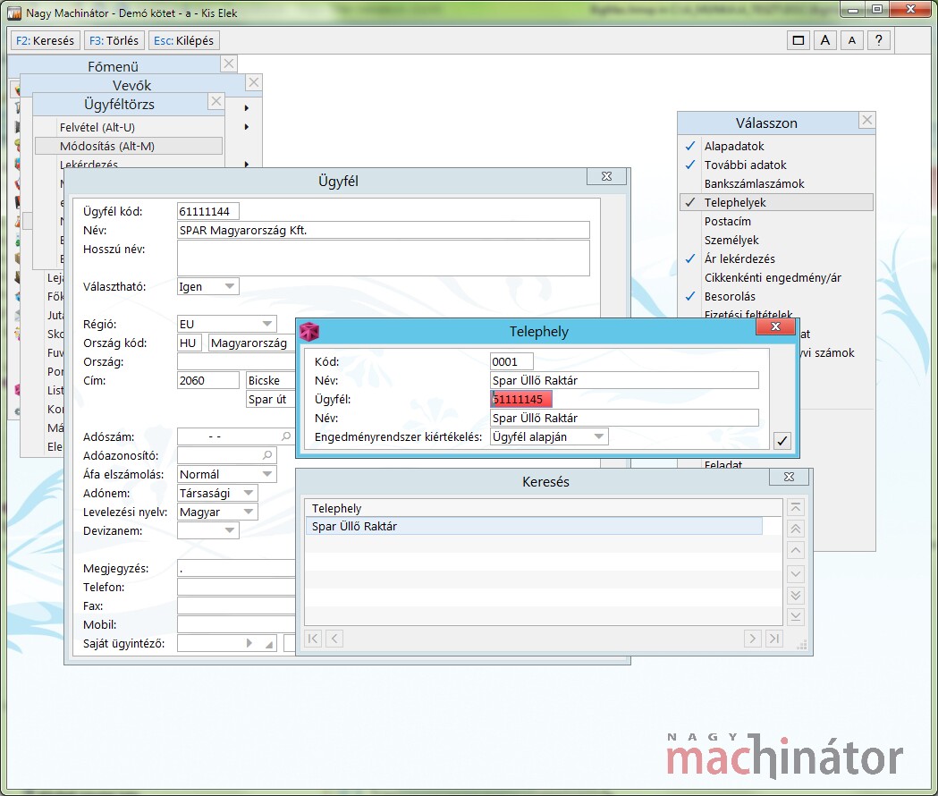 A telephelyet az ügyféltörzsbe új ügyfélkódon kell rögzíteni.