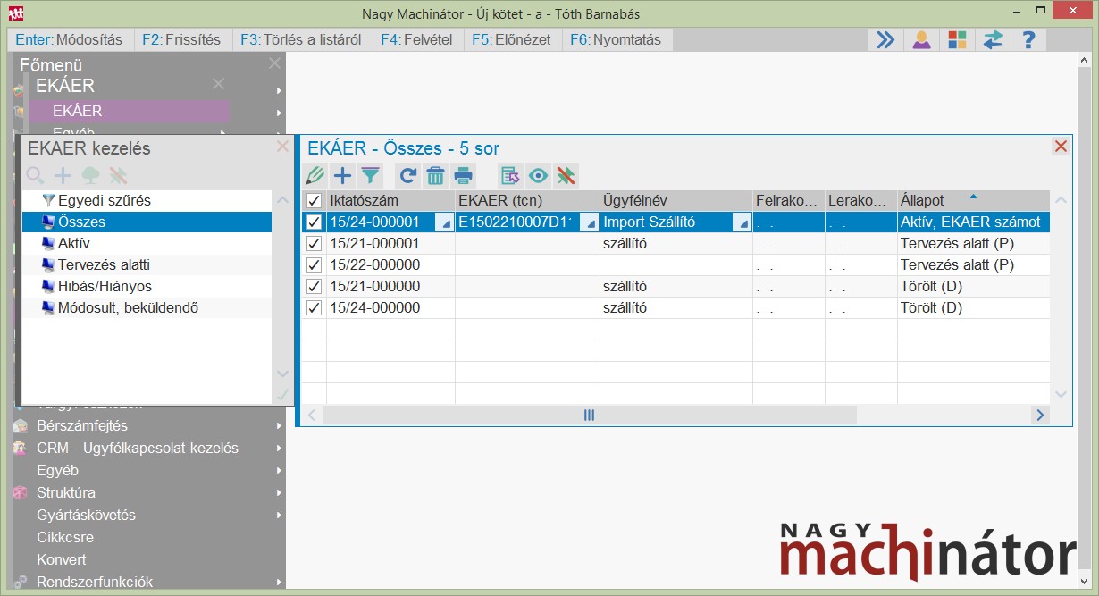 Az EKÁER modul bizonylatszámainak szűrésére szolgáló funkció.