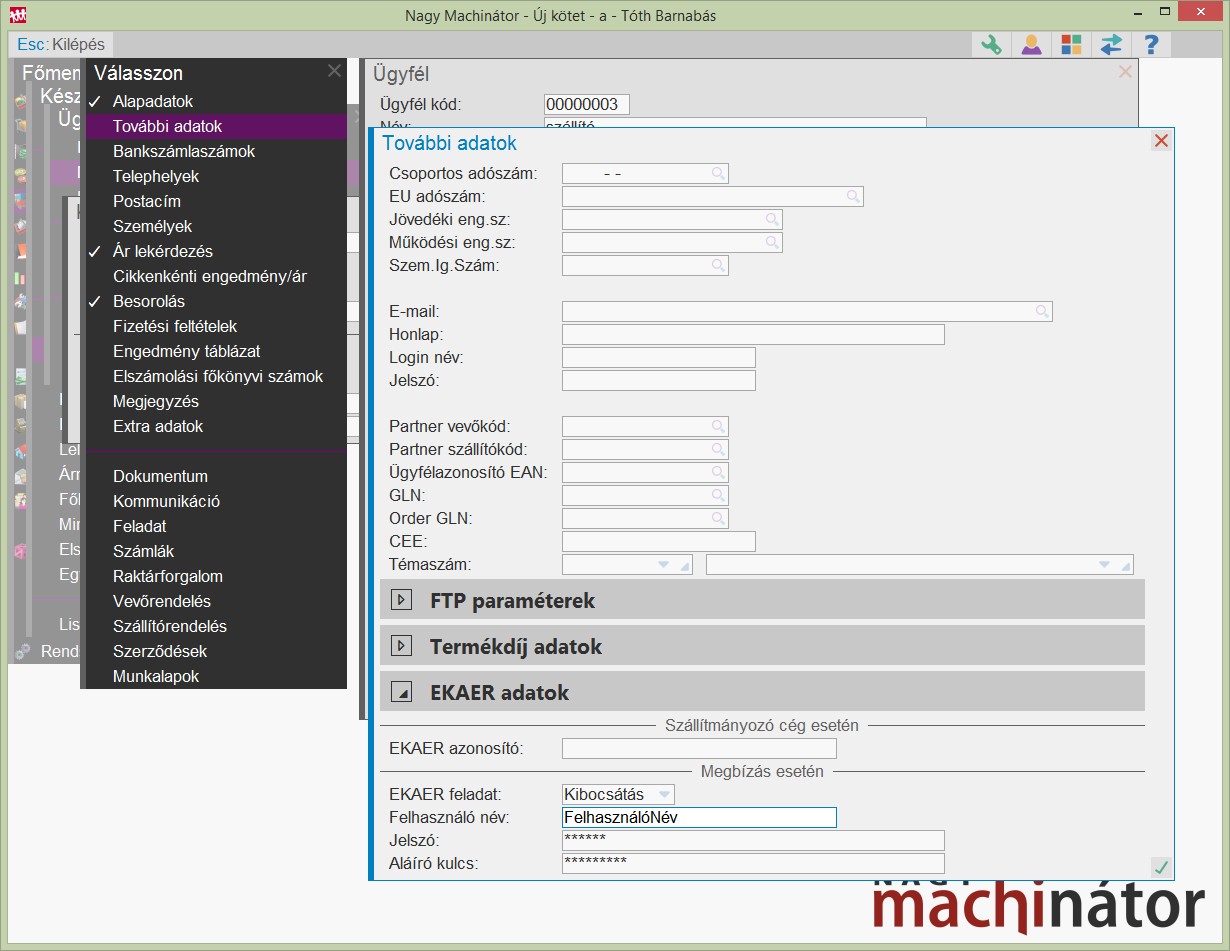 Továbbá az ügyféltörzsben meg kell adni a Szállító EKÁER-ben kapott azonosító adatait.